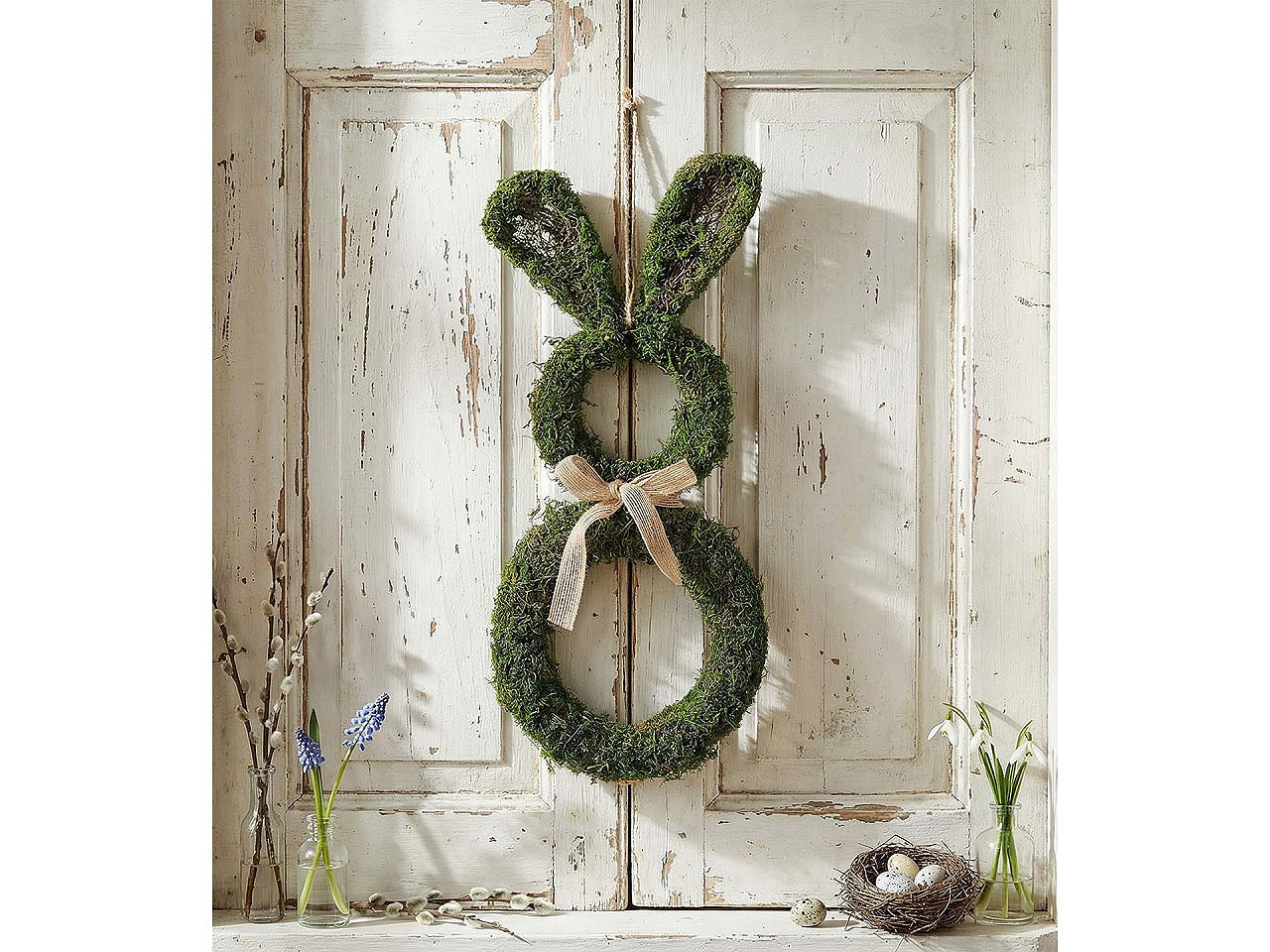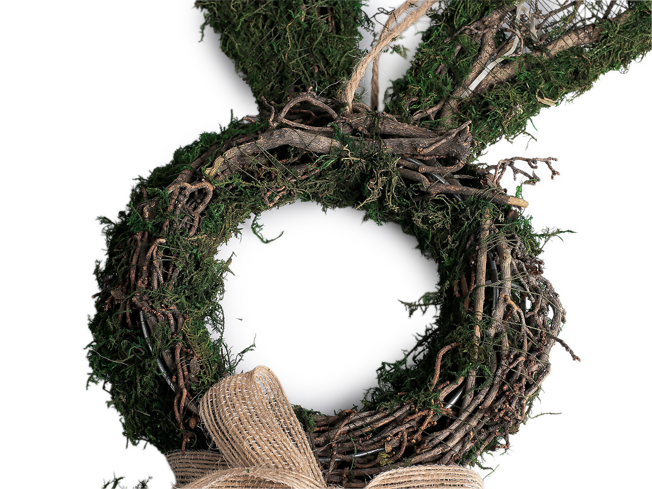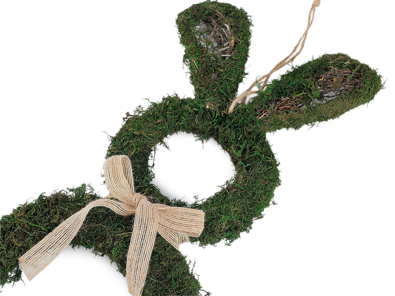 Zajíček je tvořen ze dvou proutěných věnců o průměru 15 cm a 20 cm, zdobených mechem pro autentický přírodní efekt. Díky praktickému poutku jej snadno zavěsíte na vchodové dveře, okno, stěnu či terasu.