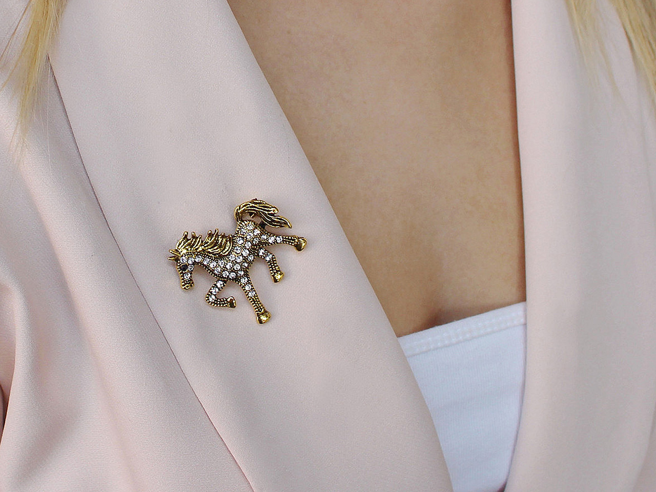 Elegantní brož kůň s třpytivými broušenými kamínky. Dodejte svému outfitu nádech luxusu s elegantní broží ve tvaru koně, osázenou drobnými broušenými kamínky, které se nádherně lesknou. Kvalitní kovový základ zajišťuje dlouhou životnost a pečlivé detaily okouzlí každého milovníka originální bižuterie. Praktické zapínání pomocí brožového špendlíku umožňuje snadné uchycení na oblečení, klobouky, kabelky či šátky.
