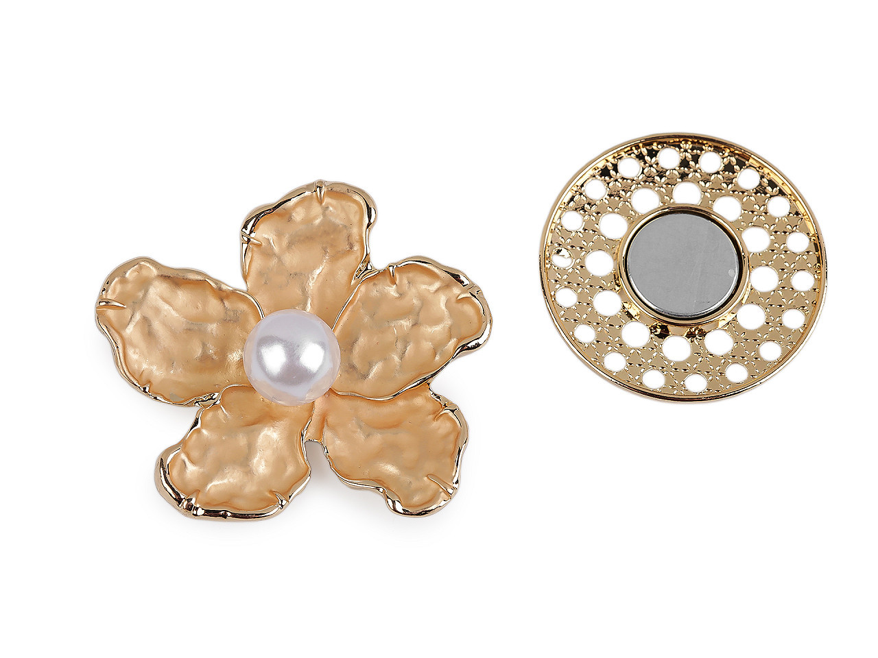 Magnetická brož květ s perlou – elegantní módní doplněk. Dodejte svému outfitu šmrnc s magnetickou broží ve tvaru květu s perlou. Tento stylový doplněk se skládá ze dvou částí – ozdobné přední strany a magnetického kolečka na zadní straně látky. Díky magnetickému uchycení je brož ideální pro pevnější materiály, jako jsou saka, kabáty, šály, klobouky či kabelky.