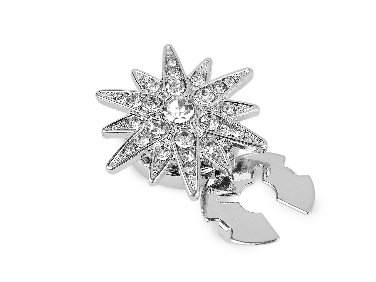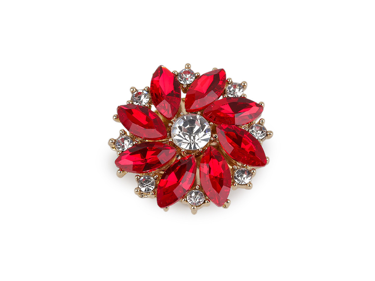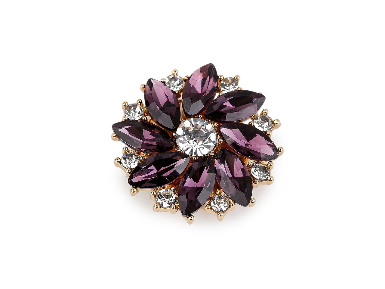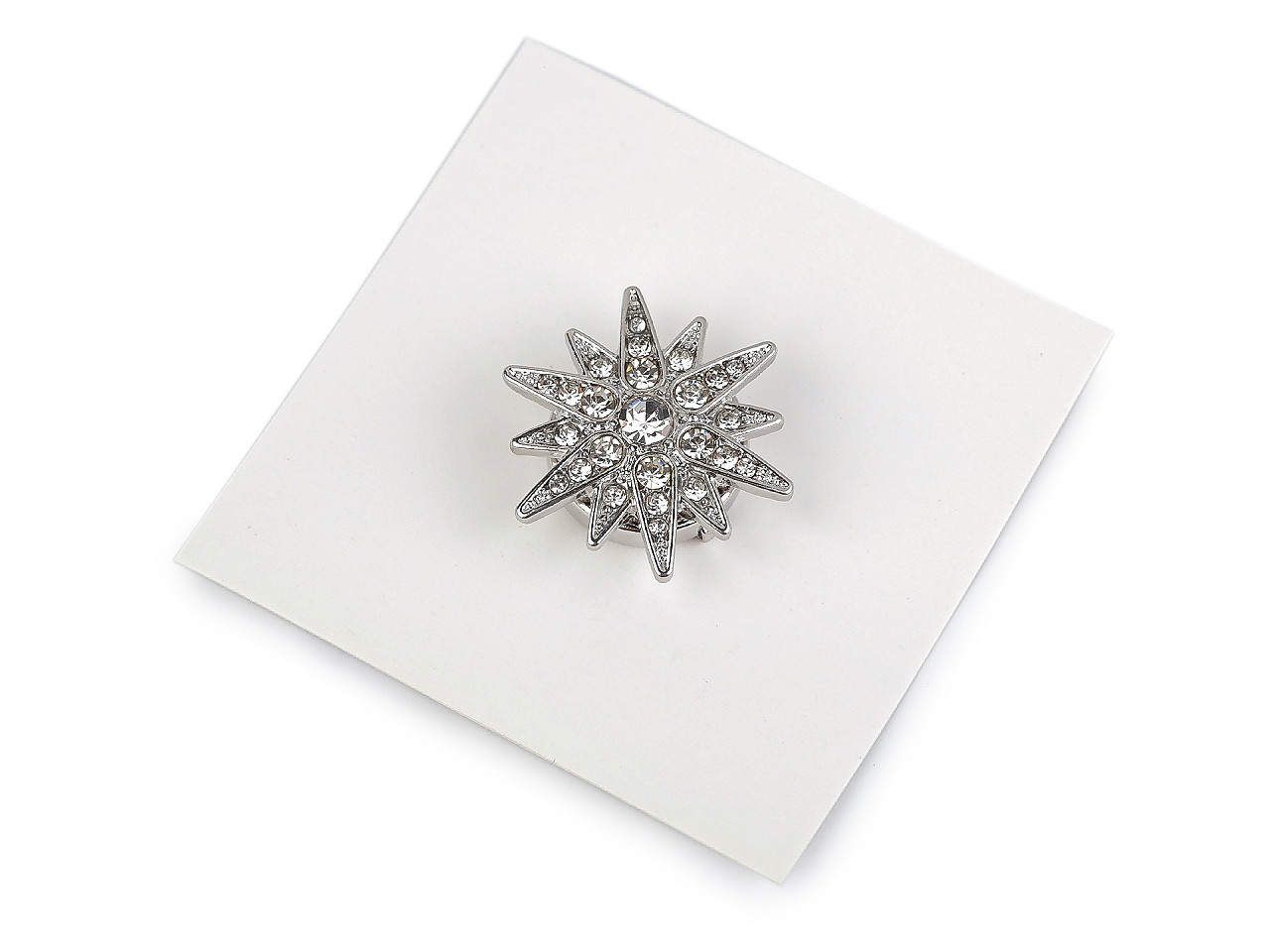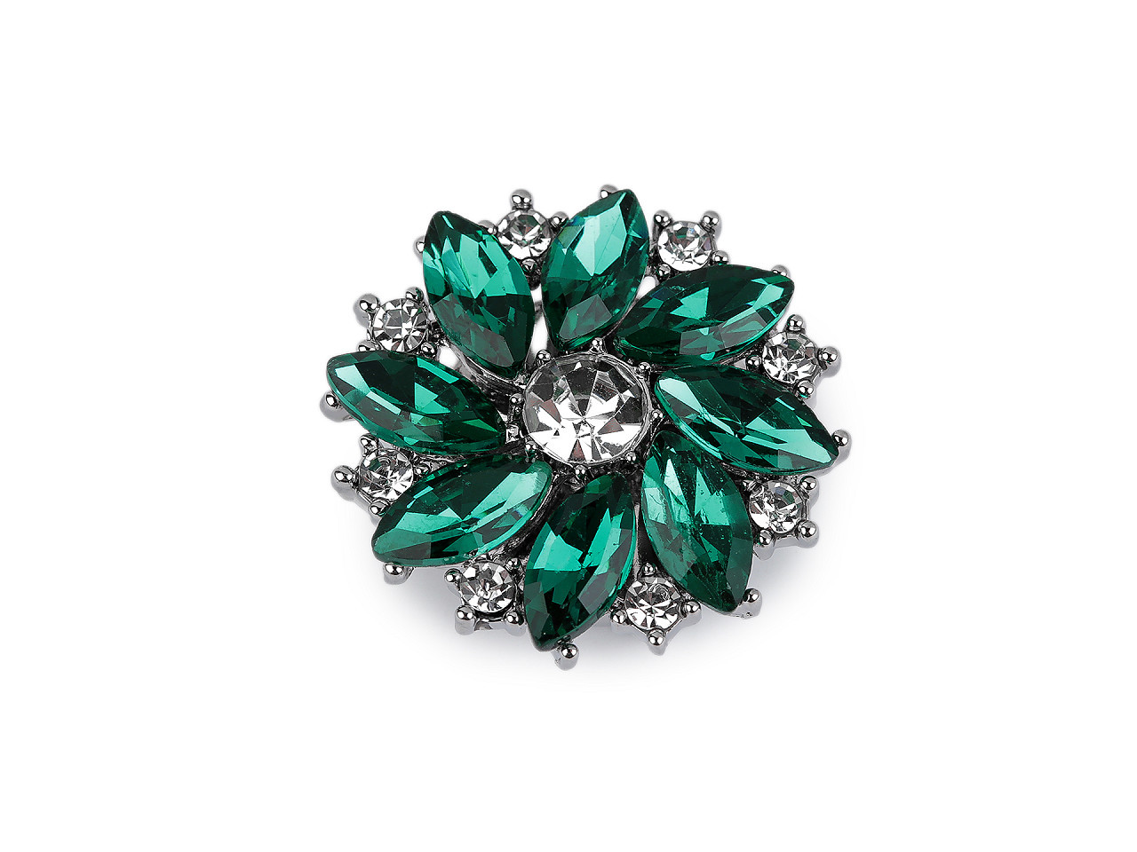 Elegantní ozdoba na knoflík s broušenými kamínky – kulatý design v květinovém stylu. Dodajte svým košilím a blůzám šmrnc s touto luxusní kulatou ozdobou na knoflík. Každý kousek je precizně zdoben broušenými kamínky, které září při každém pohybu a svým tvarem připomínají jemný květ. Ozdoba je vhodná pro knoflíky s průměrem až 1,2 cm a její aplikace je snadná – stačí ji nasadit zezadu na knoflík a zacvaknout.