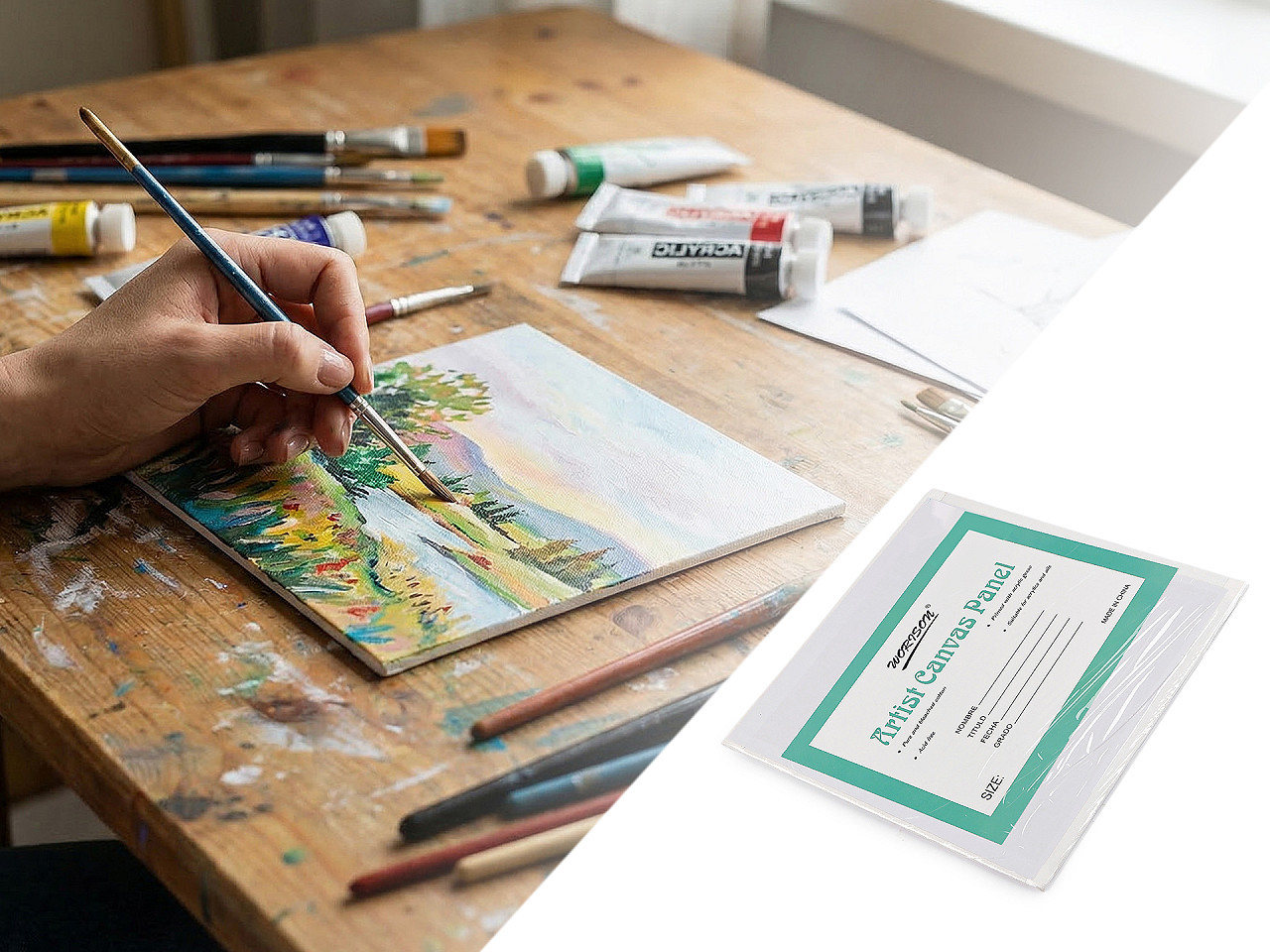 Čtvercové malířské plátno na desce – pro akryl i olejové barvy. Objevte kvalitní čtvercové malířské plátno z čisté bělené bavlny, pevně přilepené na stabilní desce. Povrch je ošetřen akrylovým gessem, které zachovává přirozený vzhled plátna a zajišťuje dokonalou přilnavost barev. Díky pevnému natažení přes hrany je plátno ideální pro precizní tvorbu. Bez kyselin, s esteticky zpracovanou zadní stranou a podlepeným papírem, představuje perfektní základ pro malování akrylovými i olejovými barvami. Skvělá volba pro profesionální i začínající malíře.