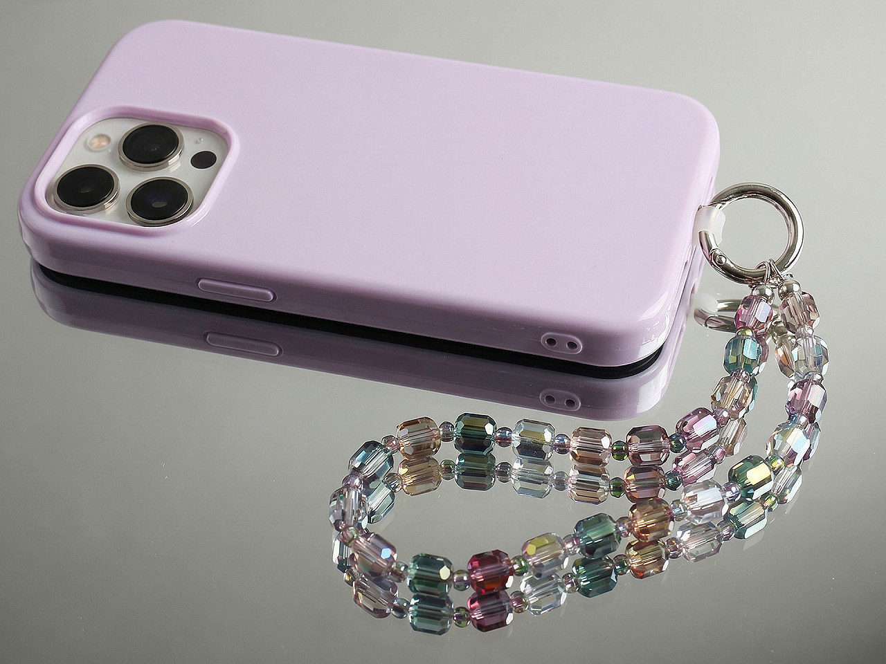 Elegantní přívěsek na mobil ze skleněných korálků s AB efektem. Dodajte svému mobilnímu telefonu styl a originalitu s luxusním přívěskem ze skleněných korálků zdobených speciální úpravou AB – Aurora borealis. Tento efekt vytváří nádherné barevné odlesky, které mění svůj vzhled podle světla, a z každého úhlu působí jedinečně.