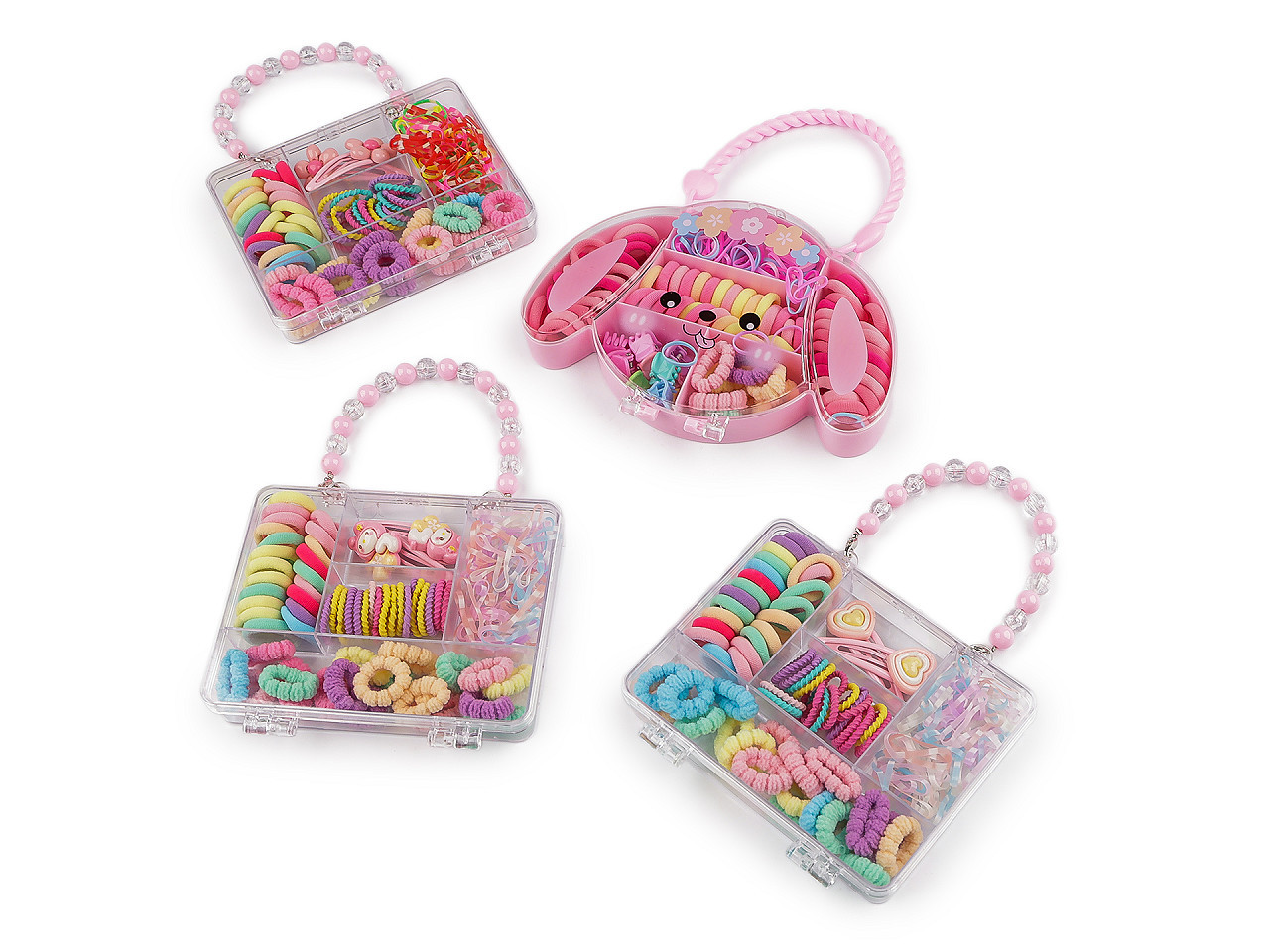 Objevte praktickou a roztomilou sadu mini gumiček a sponek do vlasů v elegantním transparentním boxu s uchem – ideální pro malé i velké milovnice kreativních účesů. Každý box je rozdělen do přihrádek, takže všechny vlasové doplňky jsou přehledně uložené a vždy po ruce.