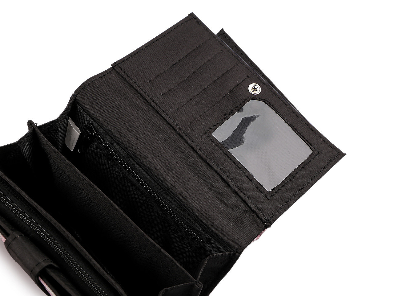 Peněženka se zavírá pomocí klopy a patentu, uvnitř má dva oddělené prostory. Praktické členění zahrnuje čtyři přihrádky na karty (jedna průhledná), velkou plochou kapsu a dvě kapsy na bankovky, z nichž jedna obsahuje zipovou kapsičku. Mincovník na levé straně se zapíná na zip, takže mince zůstanou bezpečně uložené.