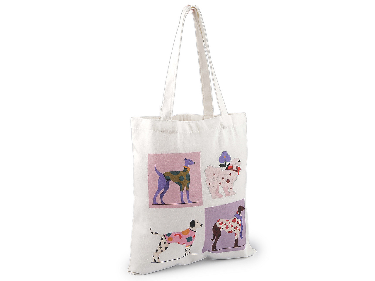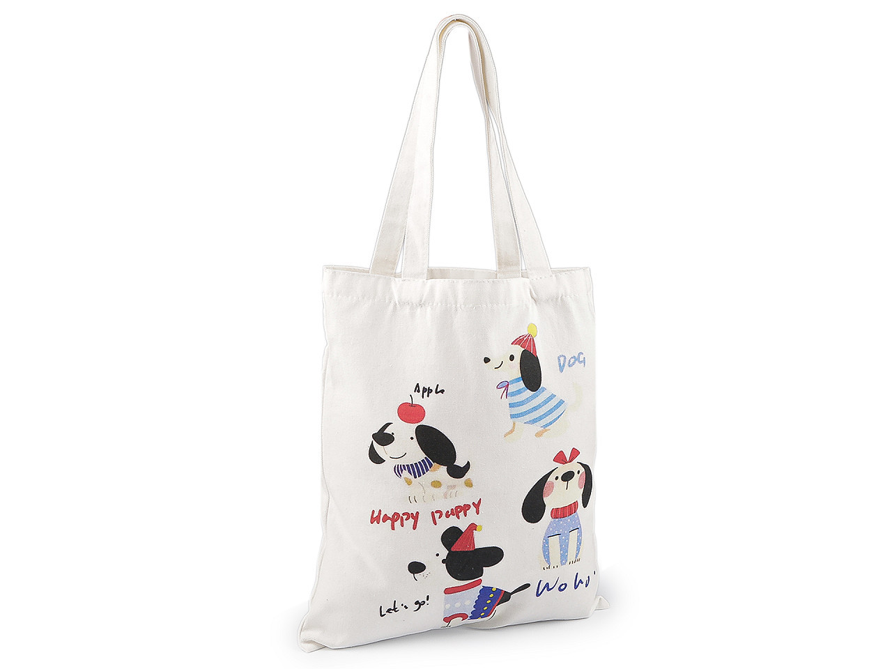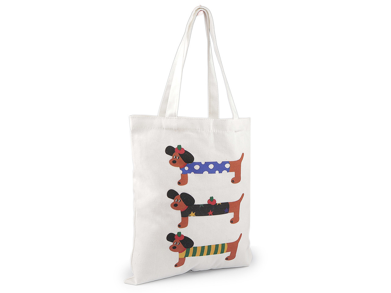 Bavlněná textilní taška s motivem pejsků – stylová a ekologická volba. Praktická textilní taška z kvalitní pevné bavlny, zdobená z obou stran veselým potiskem pejsků, potěší každého milovníka zvířat. Ideální na každodenní nákupy, knihy či drobnosti, které potřebujete mít po ruce. Taška nemá podšívku, je lehká, snadno skladná a díky tomu ji můžete nosit vždy u sebe. Vyberte si ekologickou alternativu k plastovým taškám – spojte funkčnost, odolnost a originální design do jednoho.