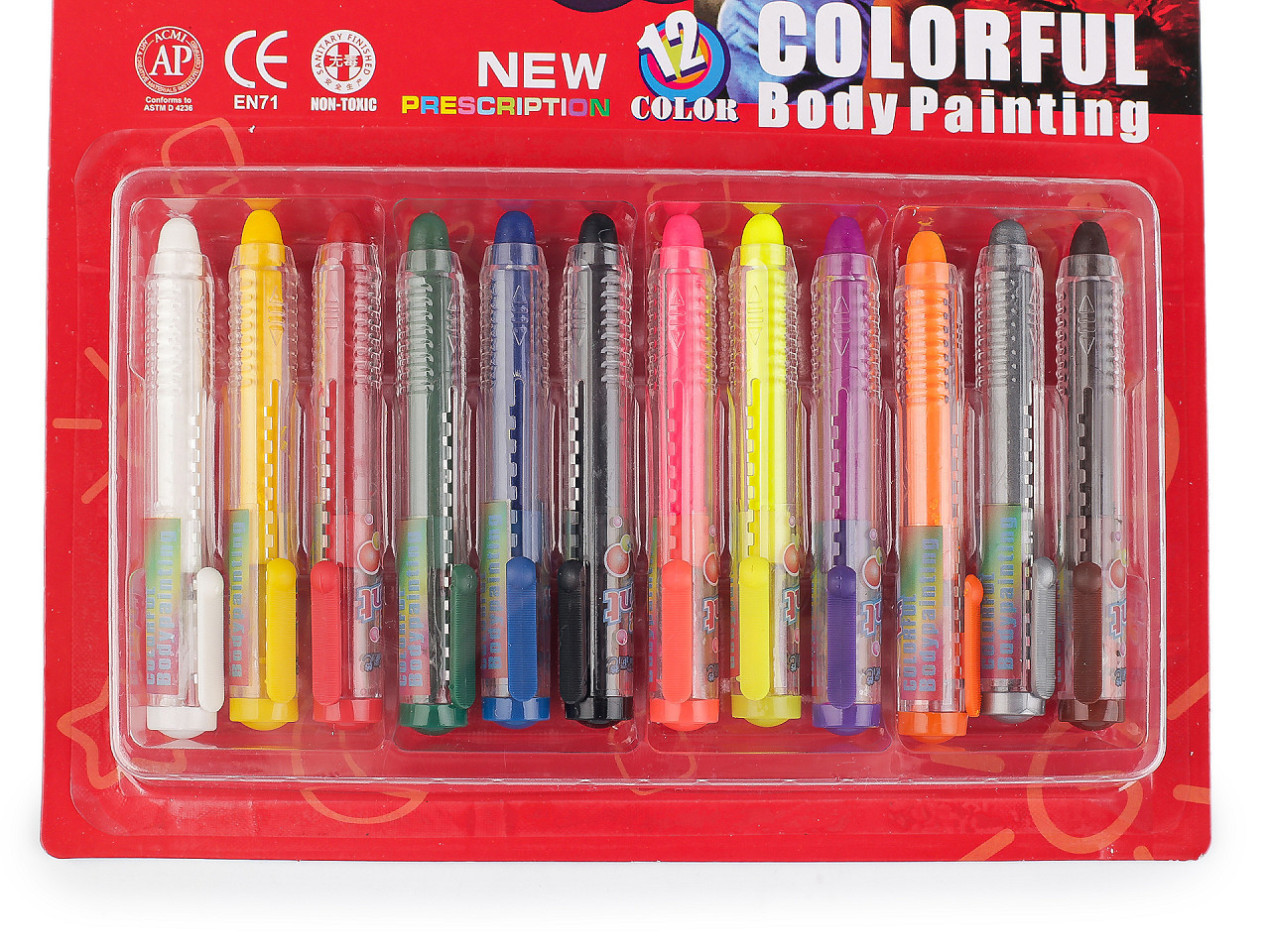 Sada 12 barev na obličej a tělo – ideální pro karneval, párty i kreativní tvorbu. Rozveselte každou oslavu originálním líčením. Tato sada 12 barevných pastelek na obličej a tělo je perfektní pro dětské karnevaly, tematické večírky, divadelní představení nebo malování na papír. Pastelky mají praktické plastové pouzdro s výsuvným mechanismem, díky kterému se snadno používají a drží čisté.
