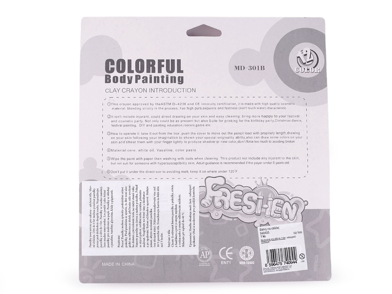Barvy jsou jemné k pokožce, snadno se smývají mýdlem, vodou nebo odličovacím mlékem. Pro nejlepší efekt nanášejte na čistou a suchou pleť. Díky všestrannému použití poslouží nejen pro malování na tělo, ale i jako běžné pastelky pro kreslení.