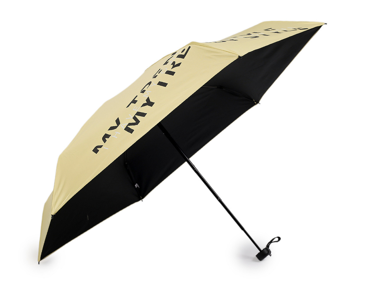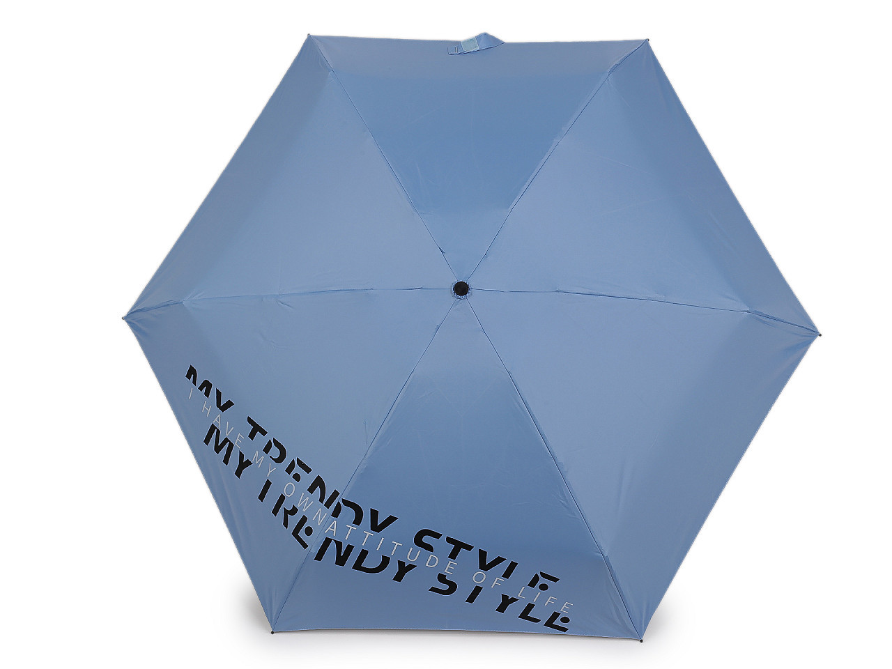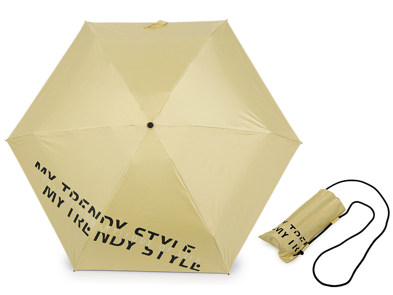 Stylový dámský mini skládací deštník s UV filtrem – lehký, kompaktní a vždy po ruce. Elegantní dámský mini skládací deštník je ideální společník do nepříznivého počasí i slunečných dní. Díky své malé velikosti a nízké hmotnosti se snadno vejde do kabelky, batohu nebo tašky. Potah s moderním nápisem My trendy style dodává deštníku šmrnc, zatímco praktické pouzdro se šňůrkou ve tvaru tašky umožňuje pohodlné nošení přes rameno.
