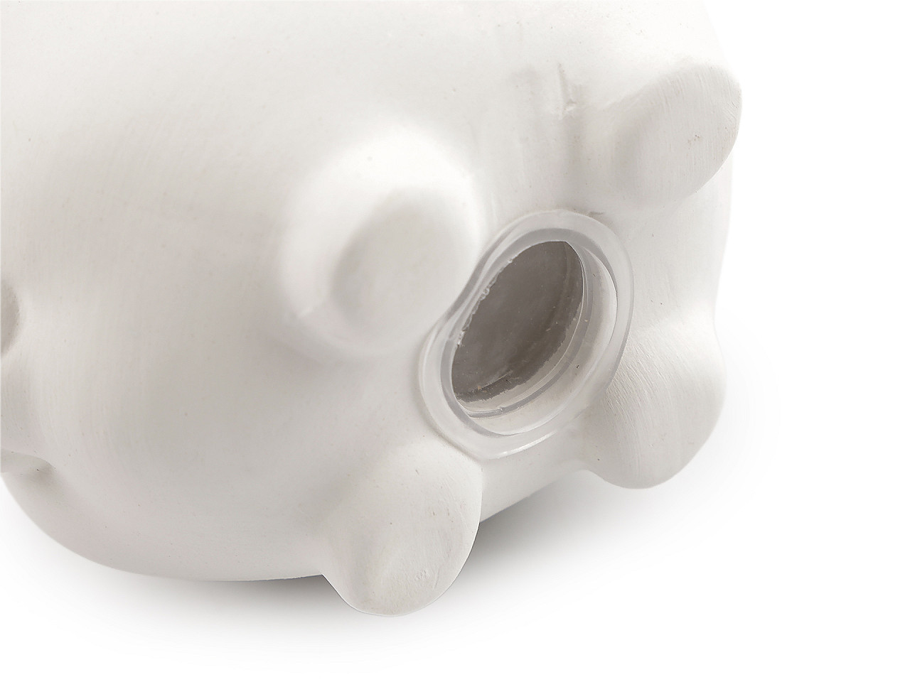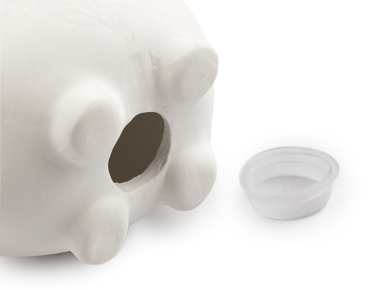 Praktický kulatý otvor ve spodní části (průměr 3 cm) se uzavírá plastovou zátkou, takže se pokladnička dá kdykoliv otevřít.