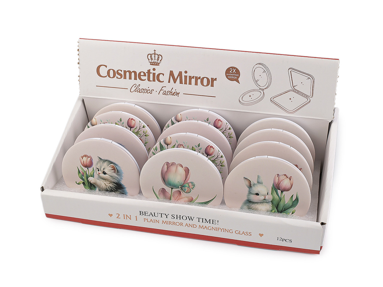 Objevte praktické kosmetické zrcátko s motivem zvířátek, které je perfektní pro každodenní péči o vzhled. Díky plochému a lehkému plastovému provedení se snadno vejde do kabelky, kosmetické taštičky nebo batohu. Uvnitř najdete dvě kvalitní zrcátka, ideální pro rychlou úpravu make-upu kdykoliv během dne. Roztomilý design s květinovými detaily a veselými zvířátky potěší děti i dospělé, a dodá vaší kosmetické výbavě hravý nádech. Stylový a funkční doplněk, který ocení každá žena i dívka.
