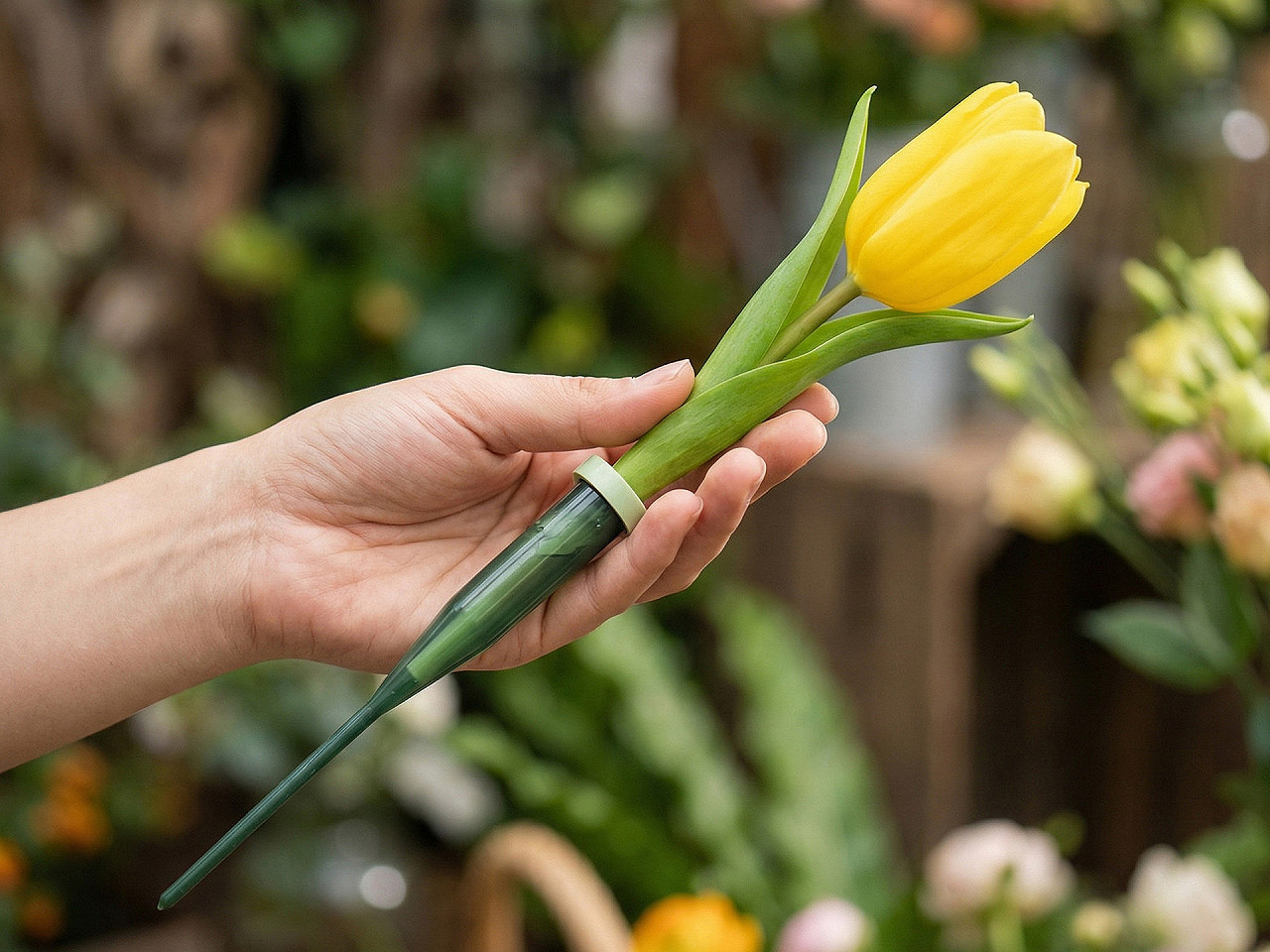 Stačí naplnit ampuli vodou, nasadit těsnicí gumové víčko, vložit stonek květiny (cca 6 cm) a zapíchnout do dekorace. Víčko zaručuje perfektní těsnění, takže voda zůstane uvnitř a květina dostává potřebnou vláhu přímo ke stonku.