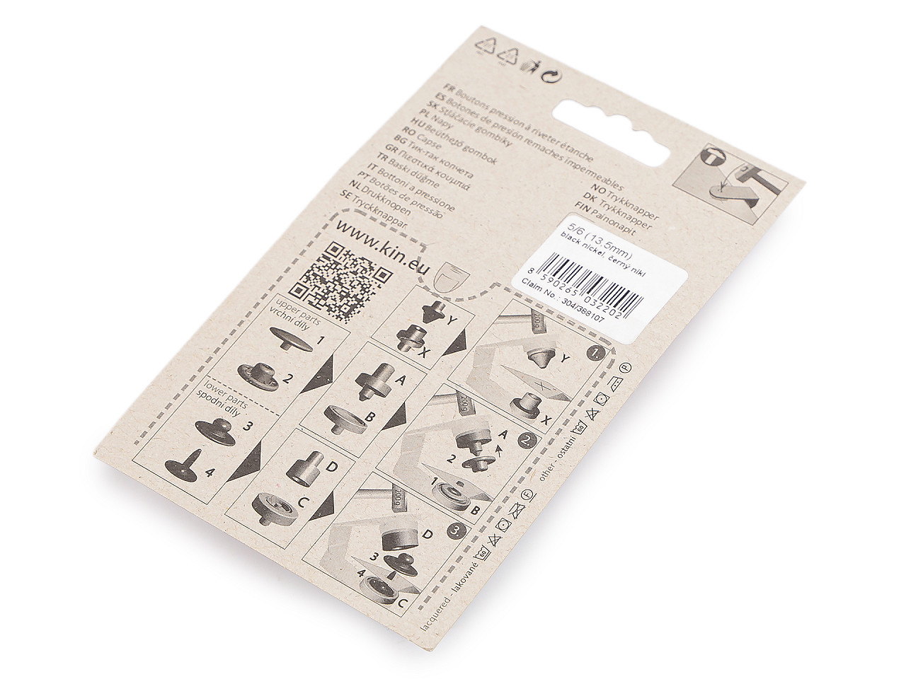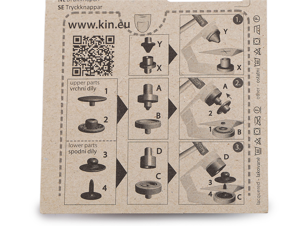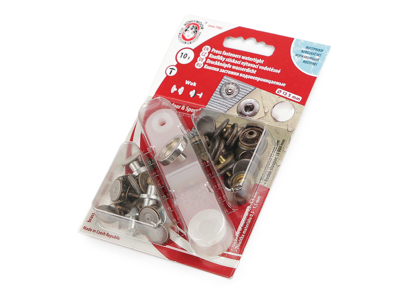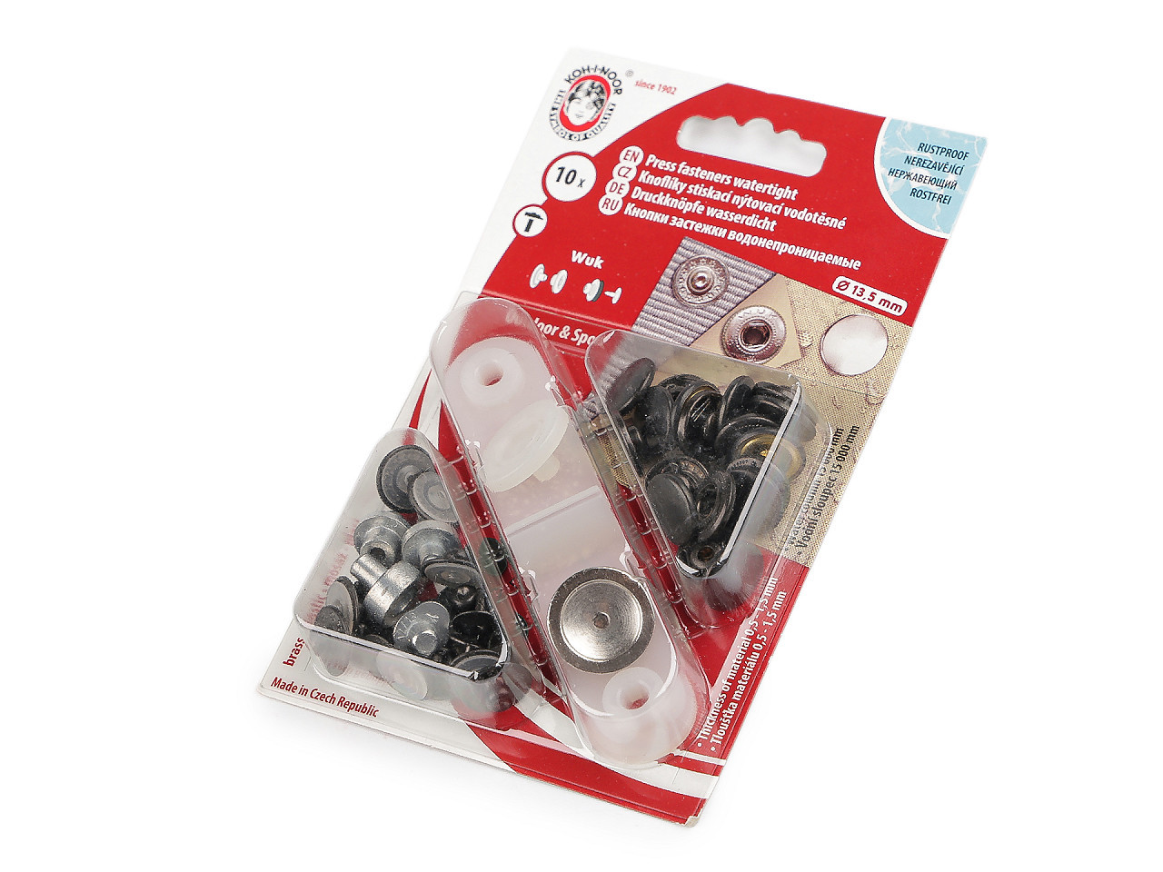 Snadná instalace – nýtování pomocí malého plastového lisu, který je součástí balení, zvládnete snadno a rychle. Knoflíky jsou vhodné pro materiály o tloušťce 0,5 – 1,5 mm.