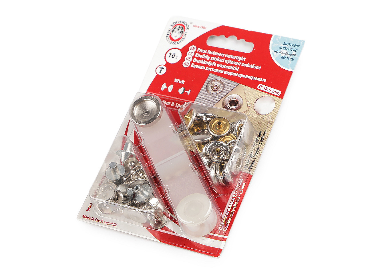 Vodotěsné stiskací knoflíky Wuk – ideální pro sportovní i pracovní oděvy. Hledáte spolehlivé zapínání pro oděvy z voděodolných materiálů? Vodotěsné stiskací knoflíky Wuk s pérkem jsou dokonalou volbou. Díky vodnímu sloupci 15 000 mm H₂O zaručují maximální ochranu před vlhkostí i za nepříznivých podmínek.