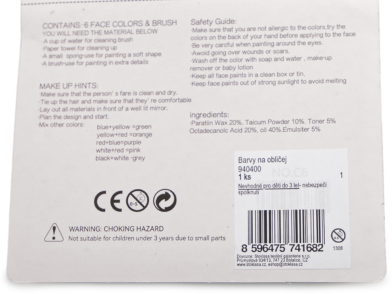 Před prvním použitím barvy otestujte na vnější straně ruky. Nepoužívejte na poraněnou nebo podrážděnou pokožku, ani po opalování. Kolem očí kreslete opatrně a nenechávejte barvu na kůži déle než 5 hodin.