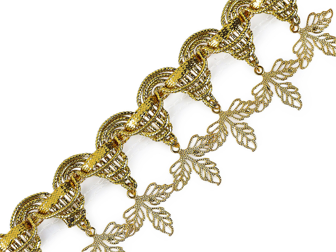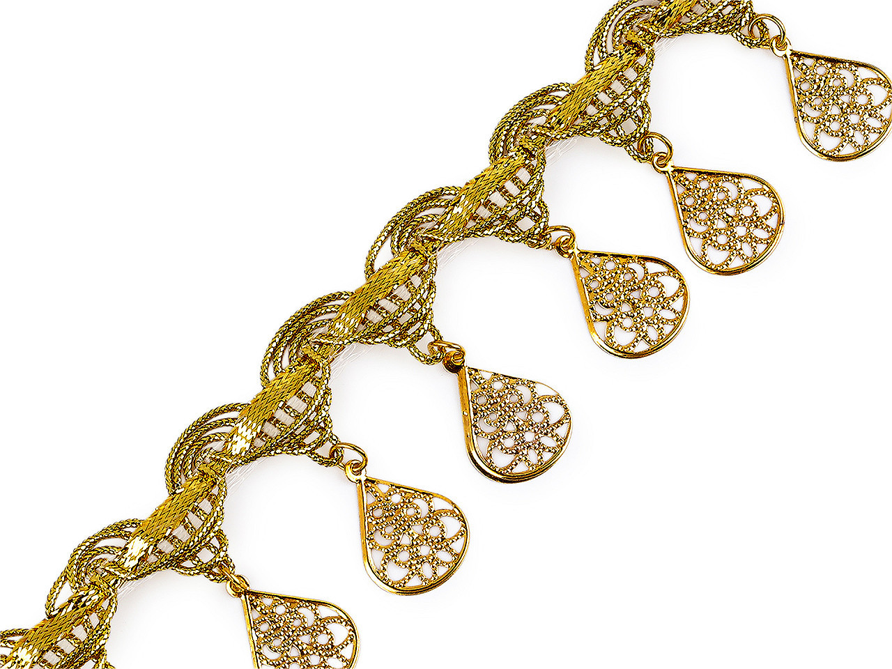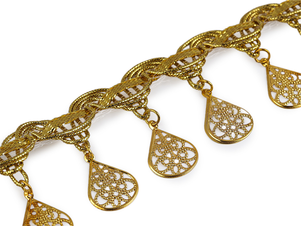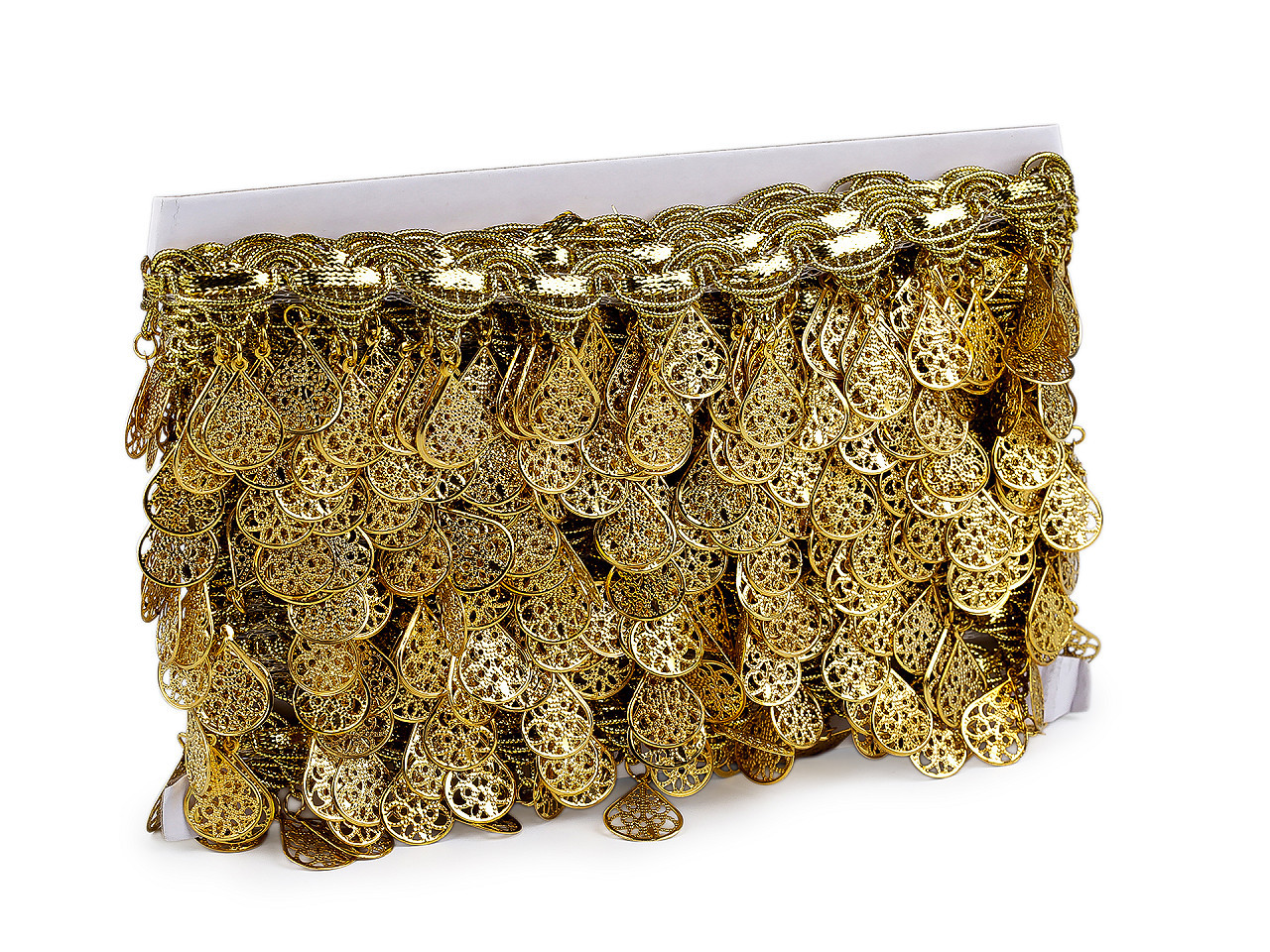 Shakira leonský prýmek s kovovými přívěsky – luxusní orientální dekorace pro kostýmy i interiéry. Dodáte svým projektům šmrnc a exotický nádech s jedinečným leonským prýmkem Shakira, zdobeným zavěšenými kovovými přívěsky. Ty při pohybu jemně cinkají a vytvářejí efekt, který znáte z kostýmů břišních tanečnic – dokonale zvýrazní každý pohyb.