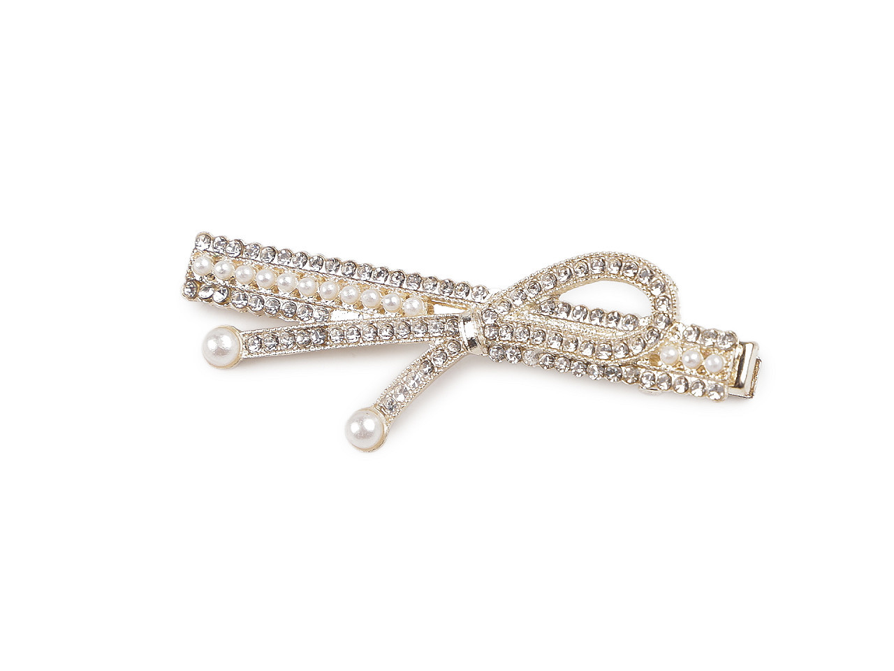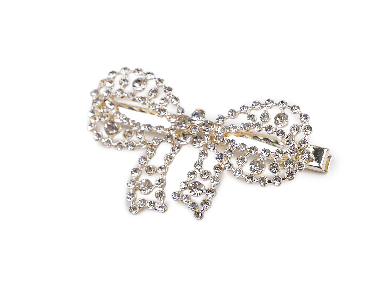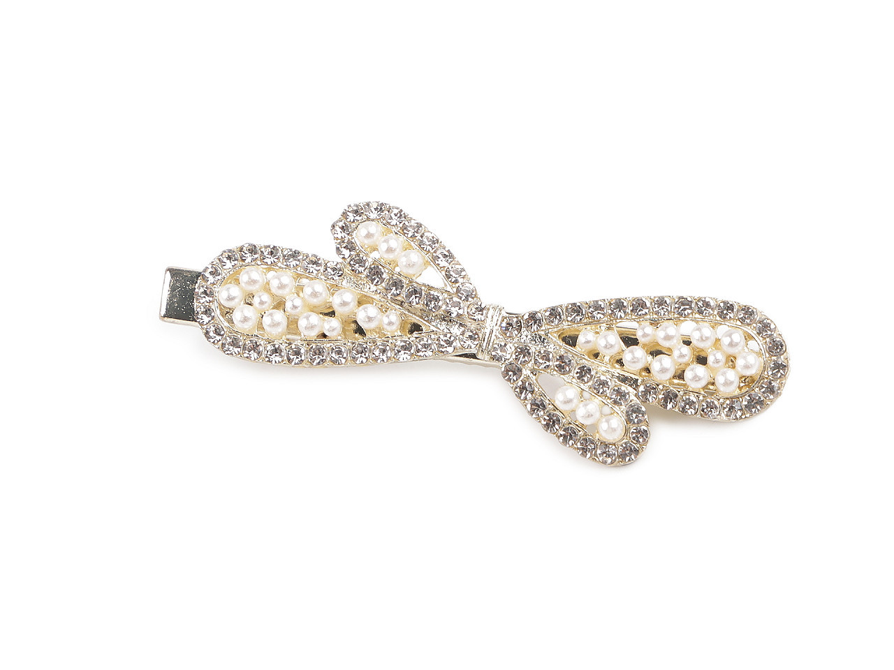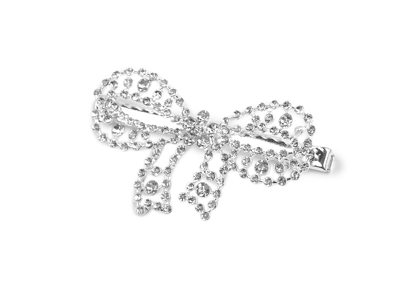 Elegantní spona do vlasů s broušenými kamínky – mašle. Dodajte svému účesu šmrnc s elegantní sponou do vlasů ve tvaru mašle, která je zdobena třpytivými broušenými kamínky. Díky kvalitnímu bižuternímu kovu a praktickým mini zoubkům perfektně drží ve vlasech po celý den. Hodí se jak na slavnostní příležitosti, večírky či svatby, tak i jako jemný doplněk ke každodennímu outfitu. Snadné upevnění oceníte u jednoduchého sepnutí i složitějších účesů.