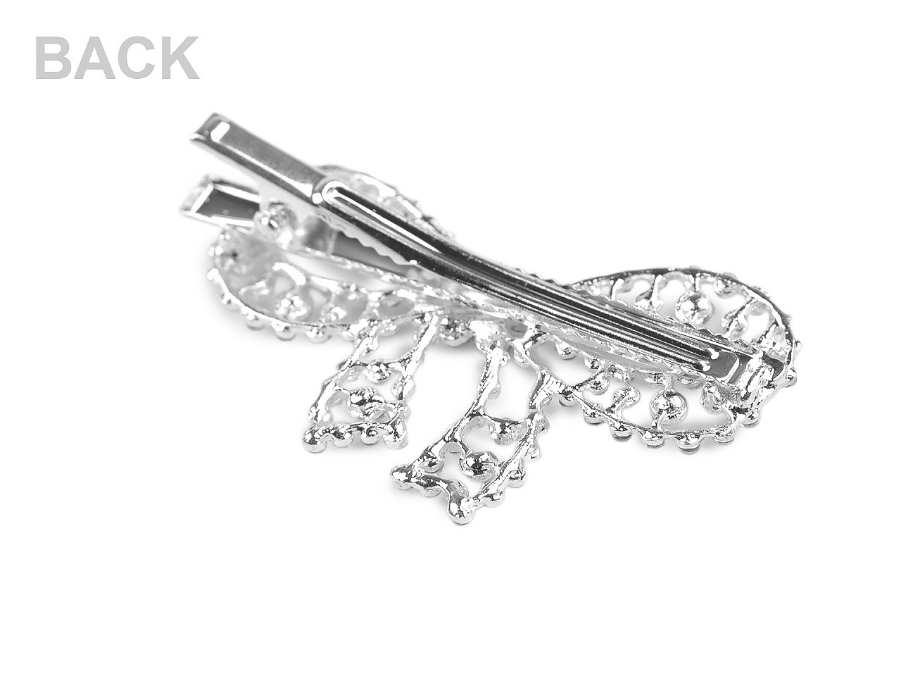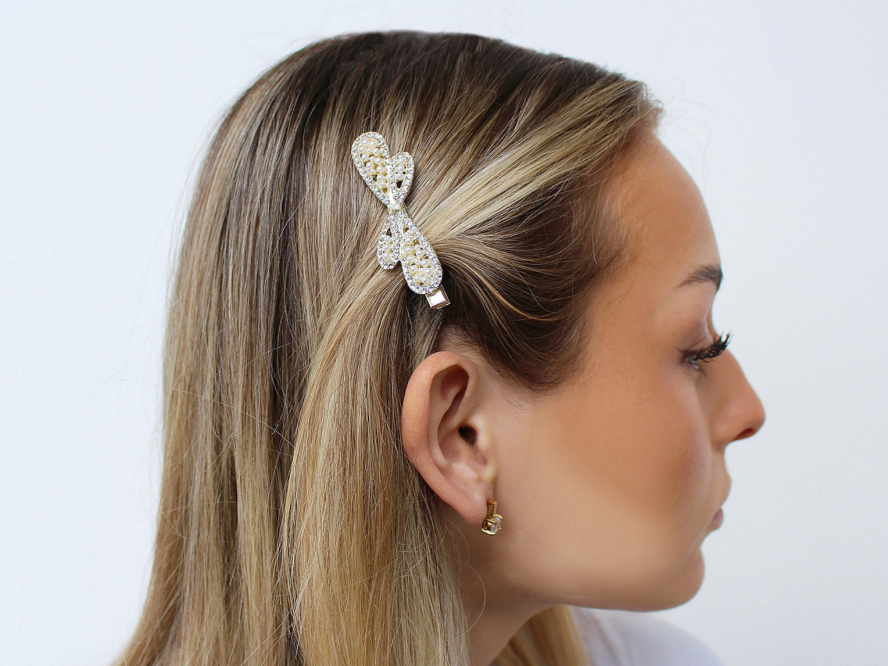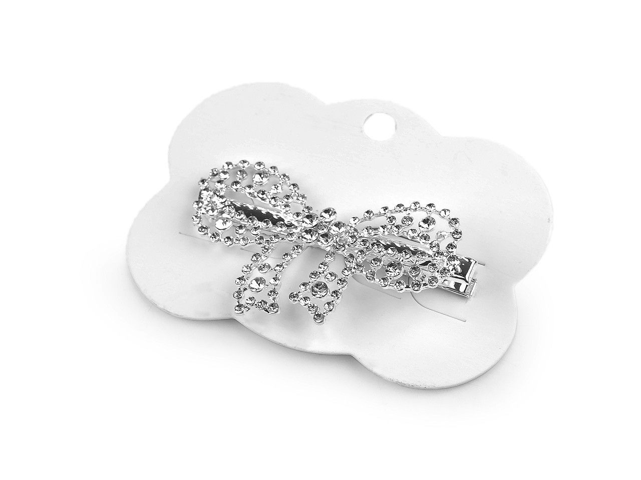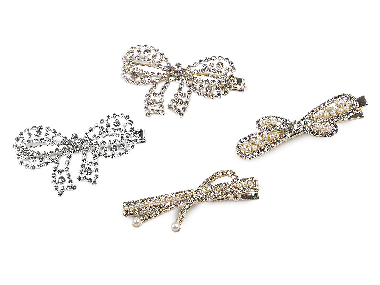 Elegantní spona do vlasů s broušenými kamínky – mašle. Dodajte svému účesu šmrnc s elegantní sponou do vlasů ve tvaru mašle, která je zdobena třpytivými broušenými kamínky. Díky kvalitnímu bižuternímu kovu a praktickým mini zoubkům perfektně drží ve vlasech po celý den. Hodí se jak na slavnostní příležitosti, večírky či svatby, tak i jako jemný doplněk ke každodennímu outfitu. Snadné upevnění oceníte u jednoduchého sepnutí i složitějších účesů.