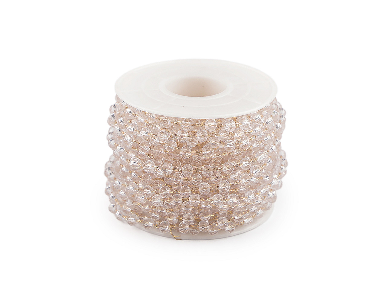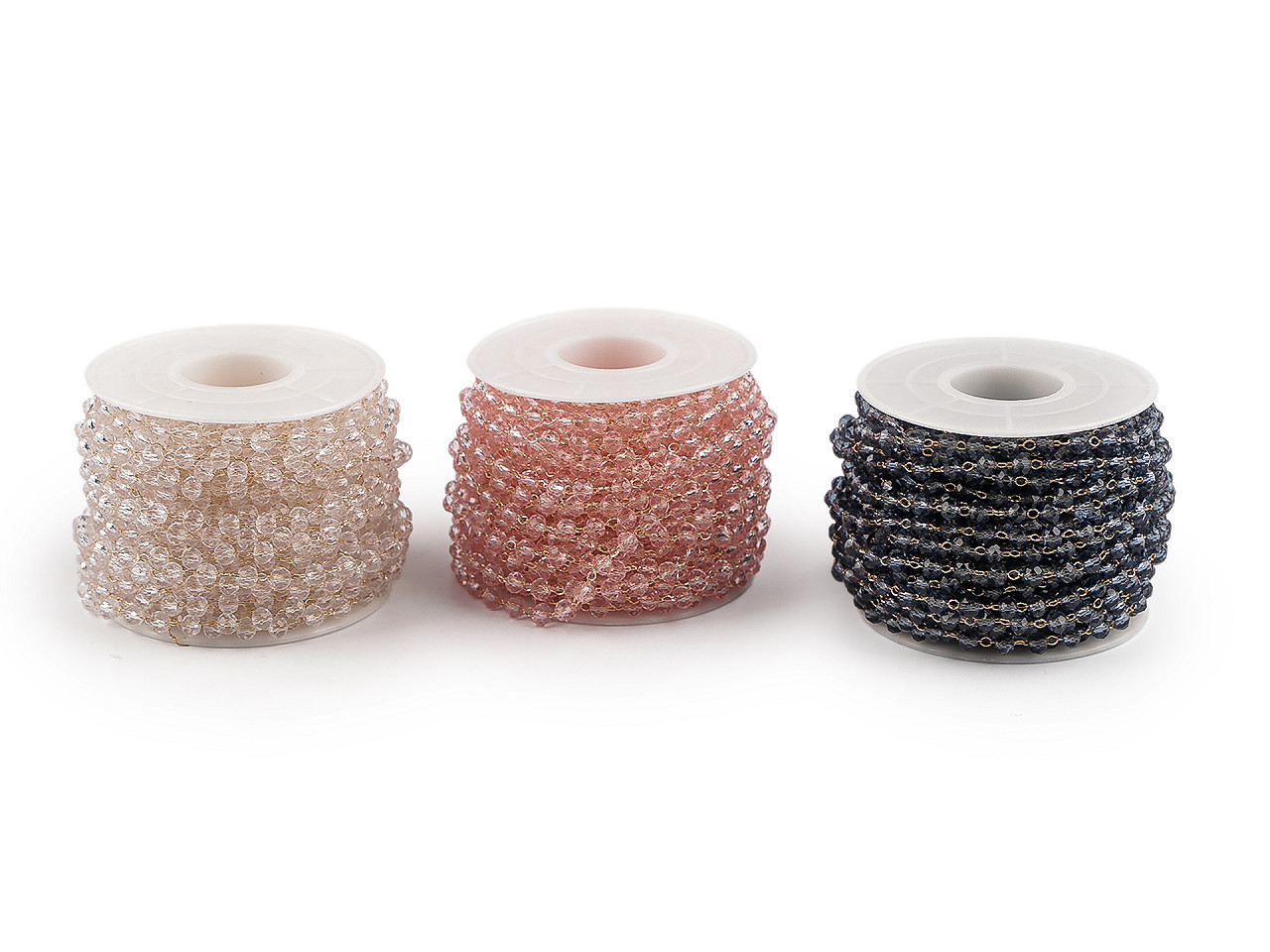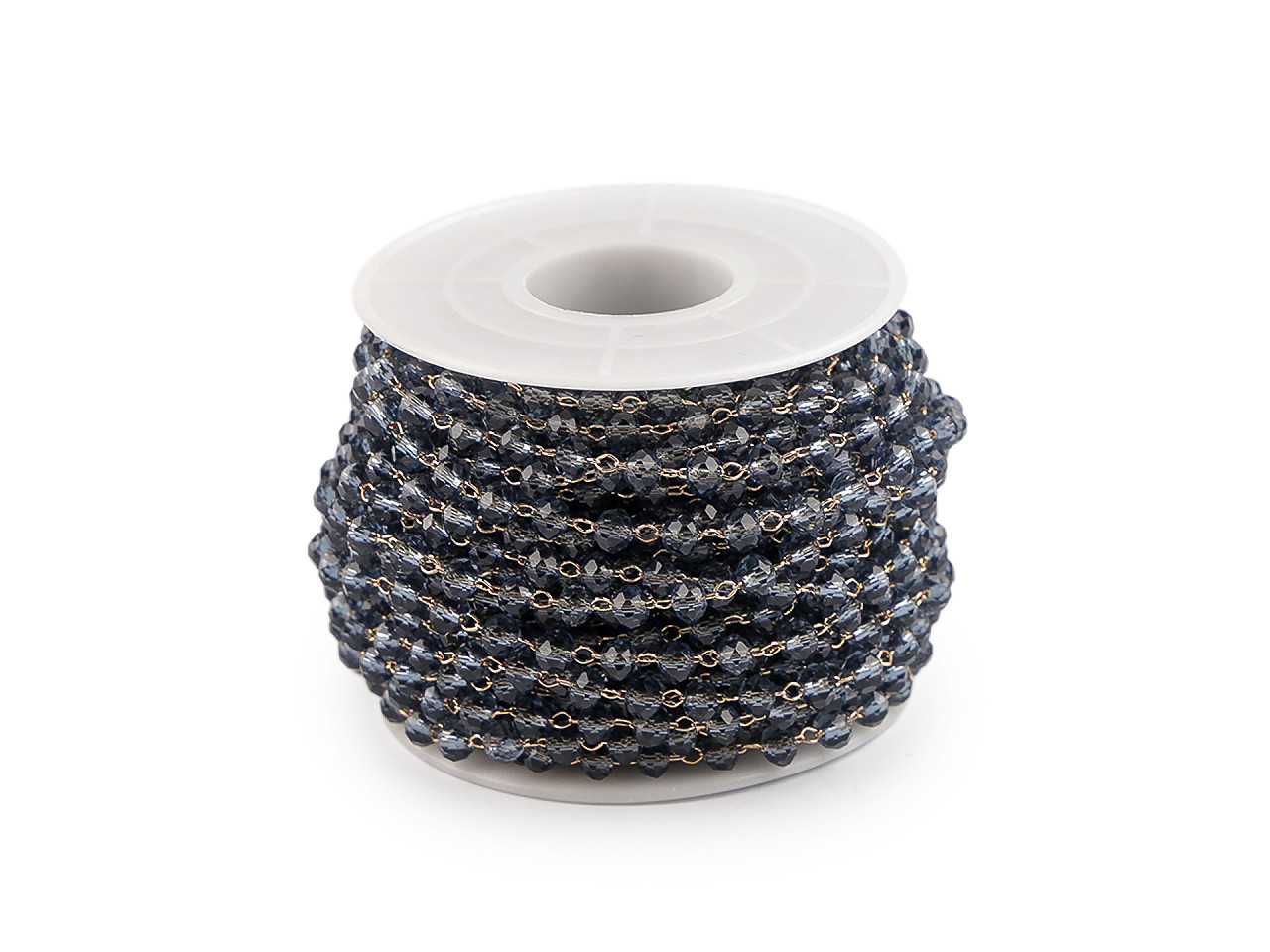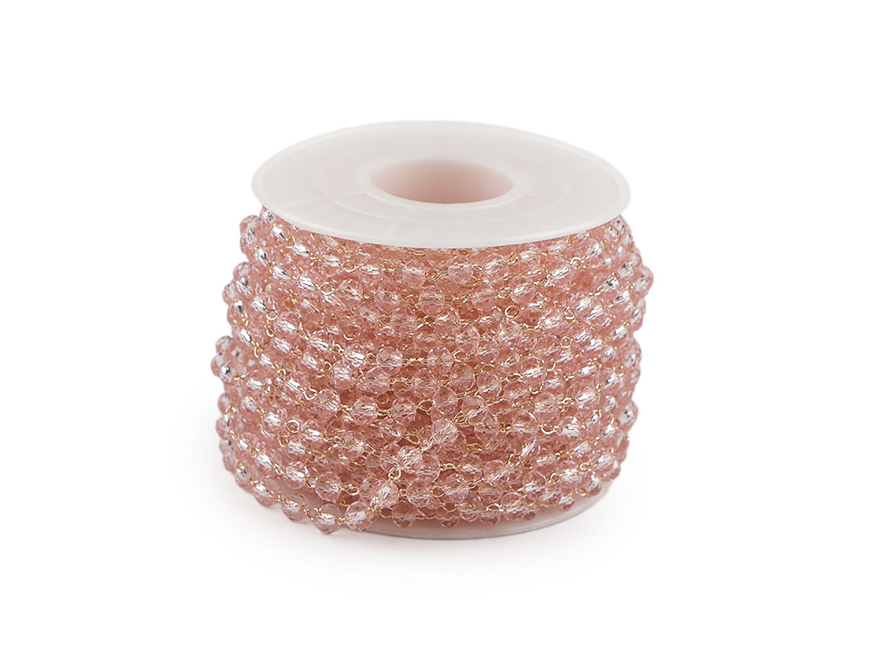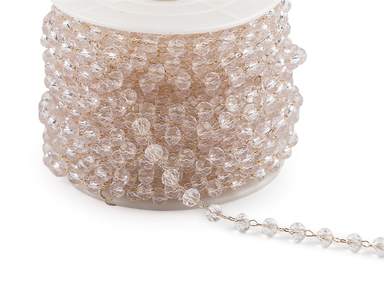 Luxusní kovový řetízek s broušenými korálky – metráž. Dodajte svým šperkům elegantní vzhled s kovovým řetízkem zdobeným broušenými korálky. Tento jemný, ale výrazný komponent je ideální pro výrobu náhrdelníků, náramků i dalších módních doplňků. Korálky jsou precizně naketlované a propojené, což zajišťuje rovnoměrný rozestup cca 4 mm. Díky očku s průvlekem o velikosti 0,8 mm snadno připojíte zapínání nebo přívěsek pomocí spojovacího kroužku.