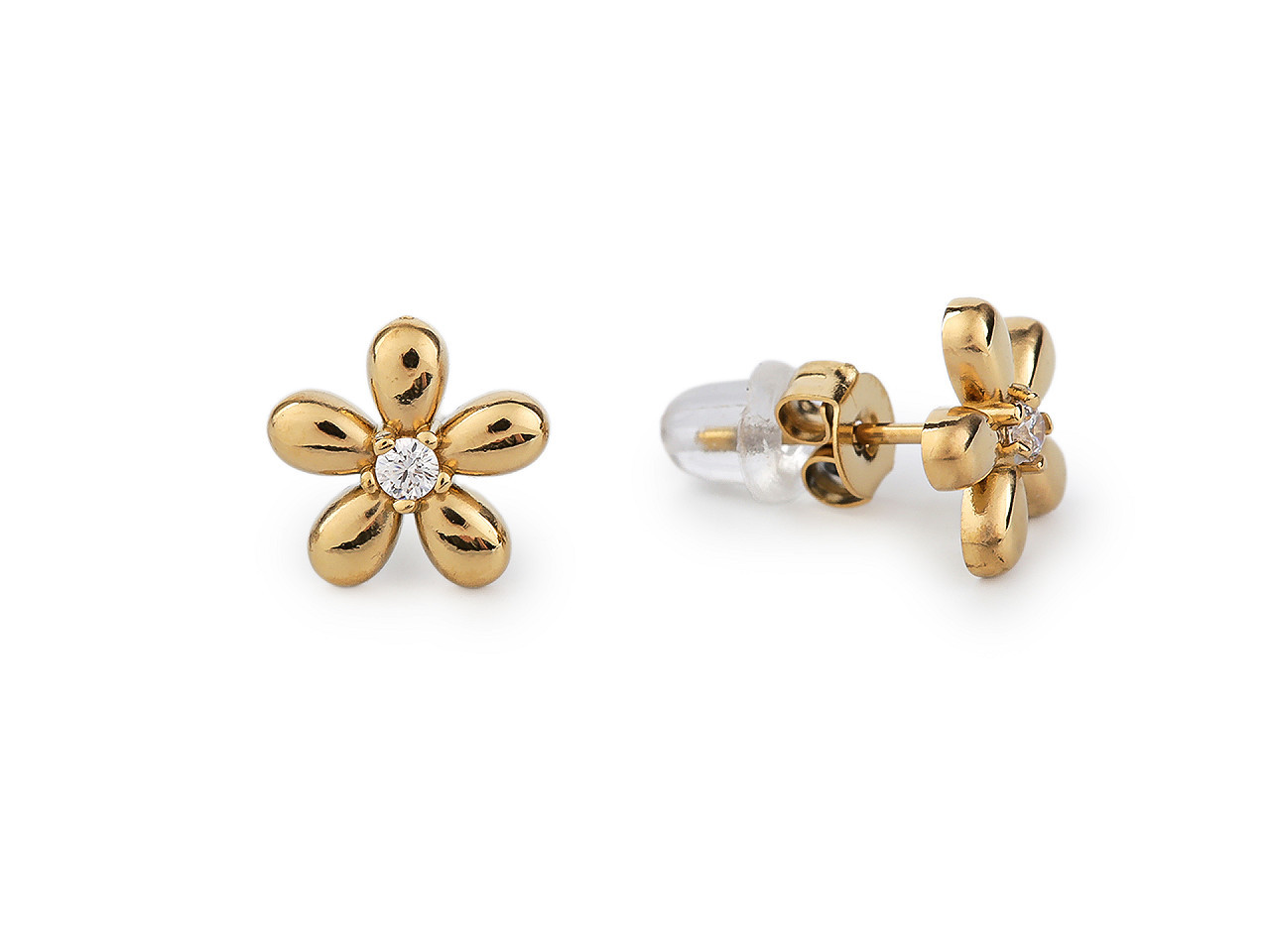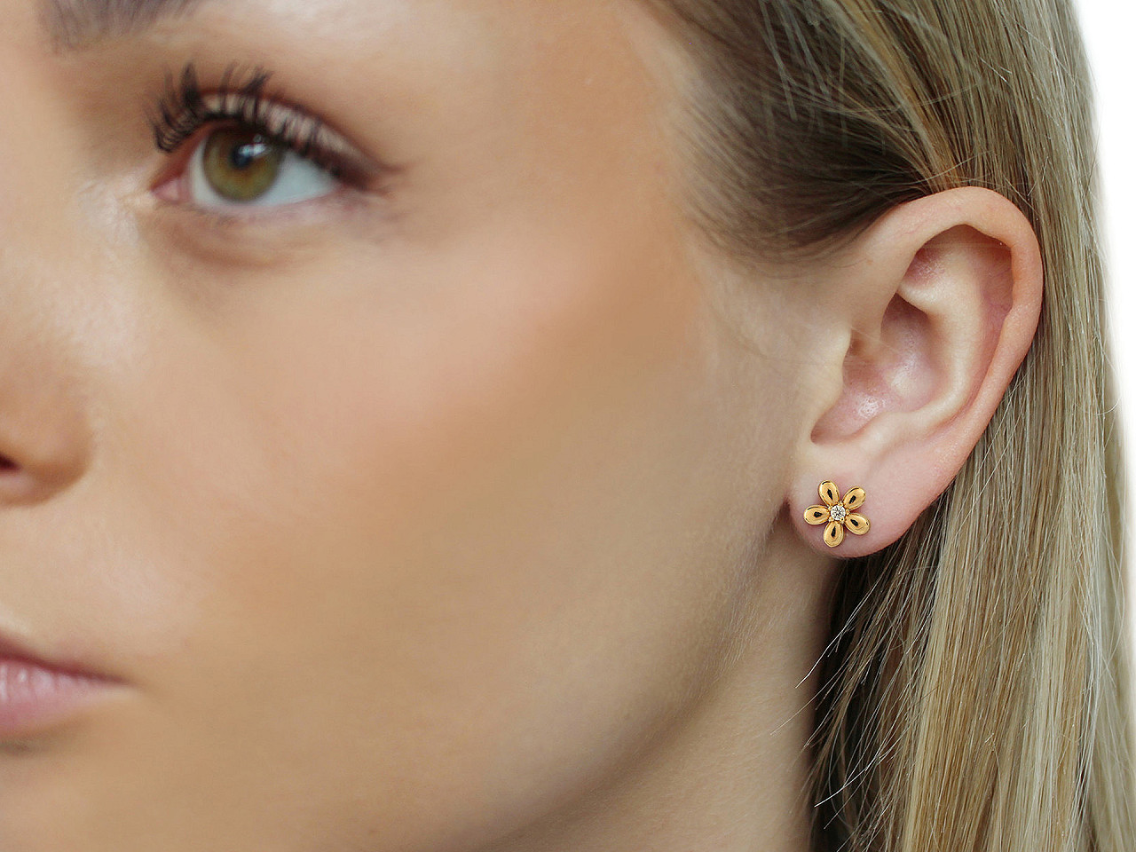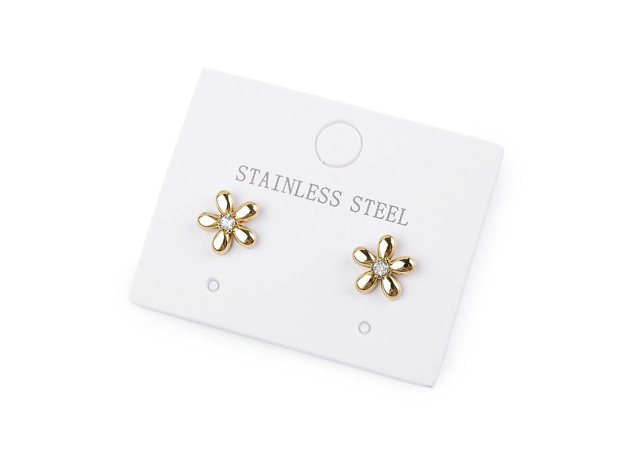 Elegantní náušnice z nerezové oceli s broušeným kamínkem – květinový design. Objevte kouzlo nadčasových náušnic z kvalitní nerezové oceli, které vynikají jemným květinovým tvarem a precizním provedením. Uprostřed každého květu září broušený kamínek, dodávající šperku elegantní lesk a jedinečný šarm.