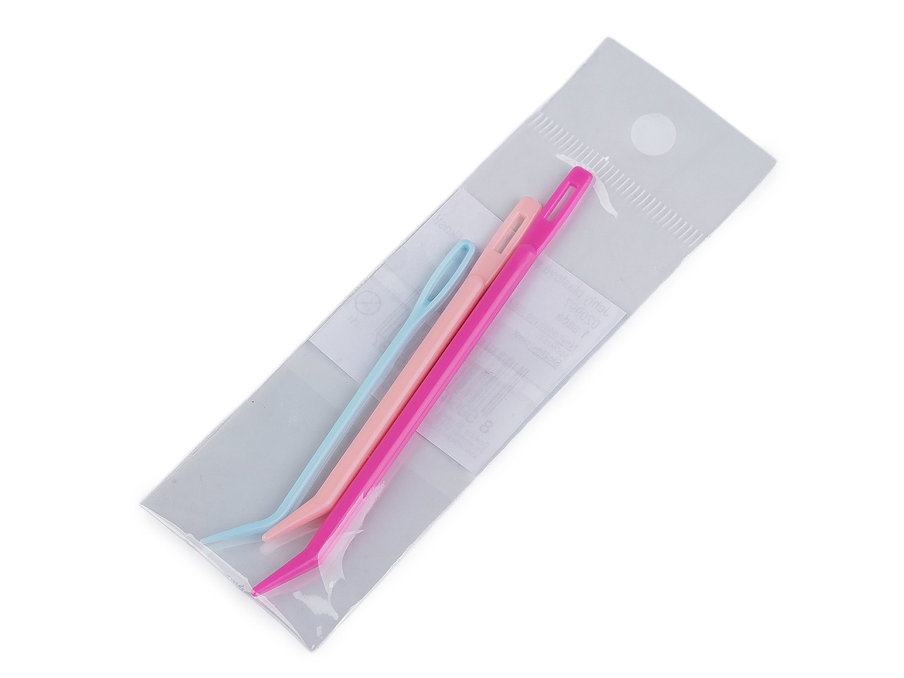 Praktická sada 3 plastových jehel se zahnutou špičkou je ideální pro práci se silnějšími přízemi. Díky velkému očku a tupé špičce jsou perfektní pro sešívání, zapošívání a dokončovací práce na pletených i háčkovaných projektech. Jehly jsou lehké, ohebné a odolné proti lámání, což zajišťuje pohodlné použití a dlouhou životnost.