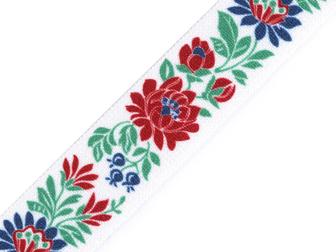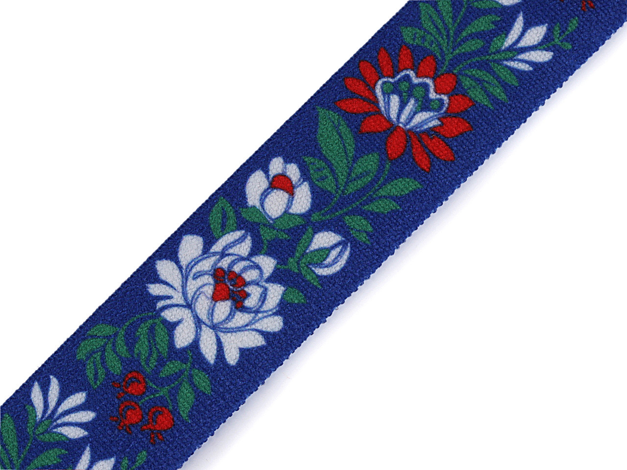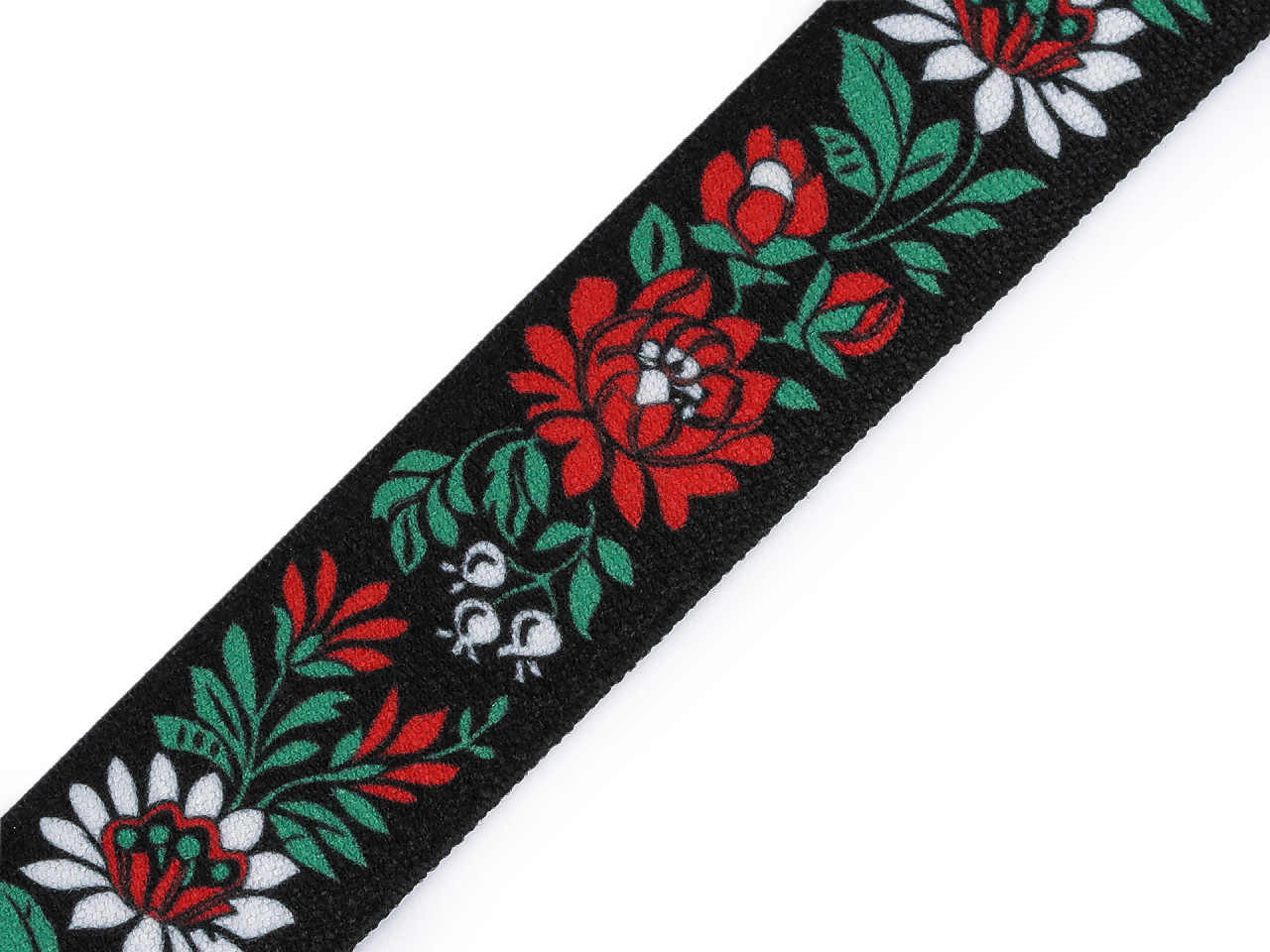 Pruženka s folklorním motivem – pevná a dekorativní. Oživte své šití a kreativní projekty pruženkou s krásným folklorním vzorem. Tento originální design vnese do každého výrobku nádech tradiční lidové kultury. Pruženka je ideální pro výrobu šlí, pásků, dekorativního lemování u šatů, sukní či dalších módních i bytových doplňků.