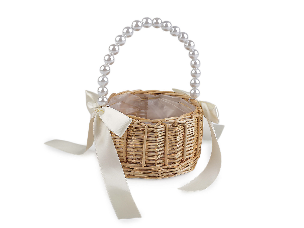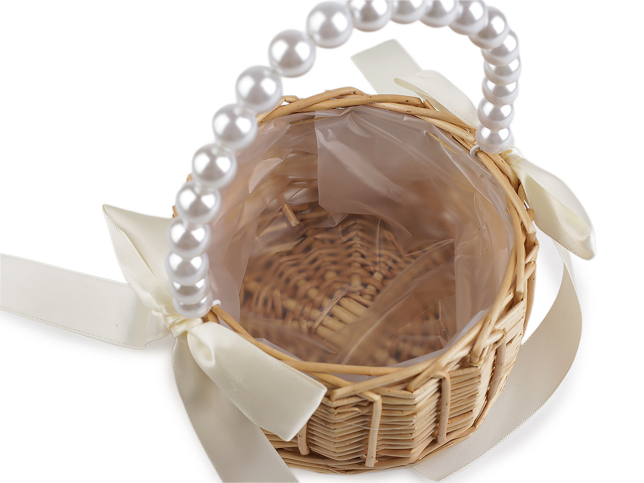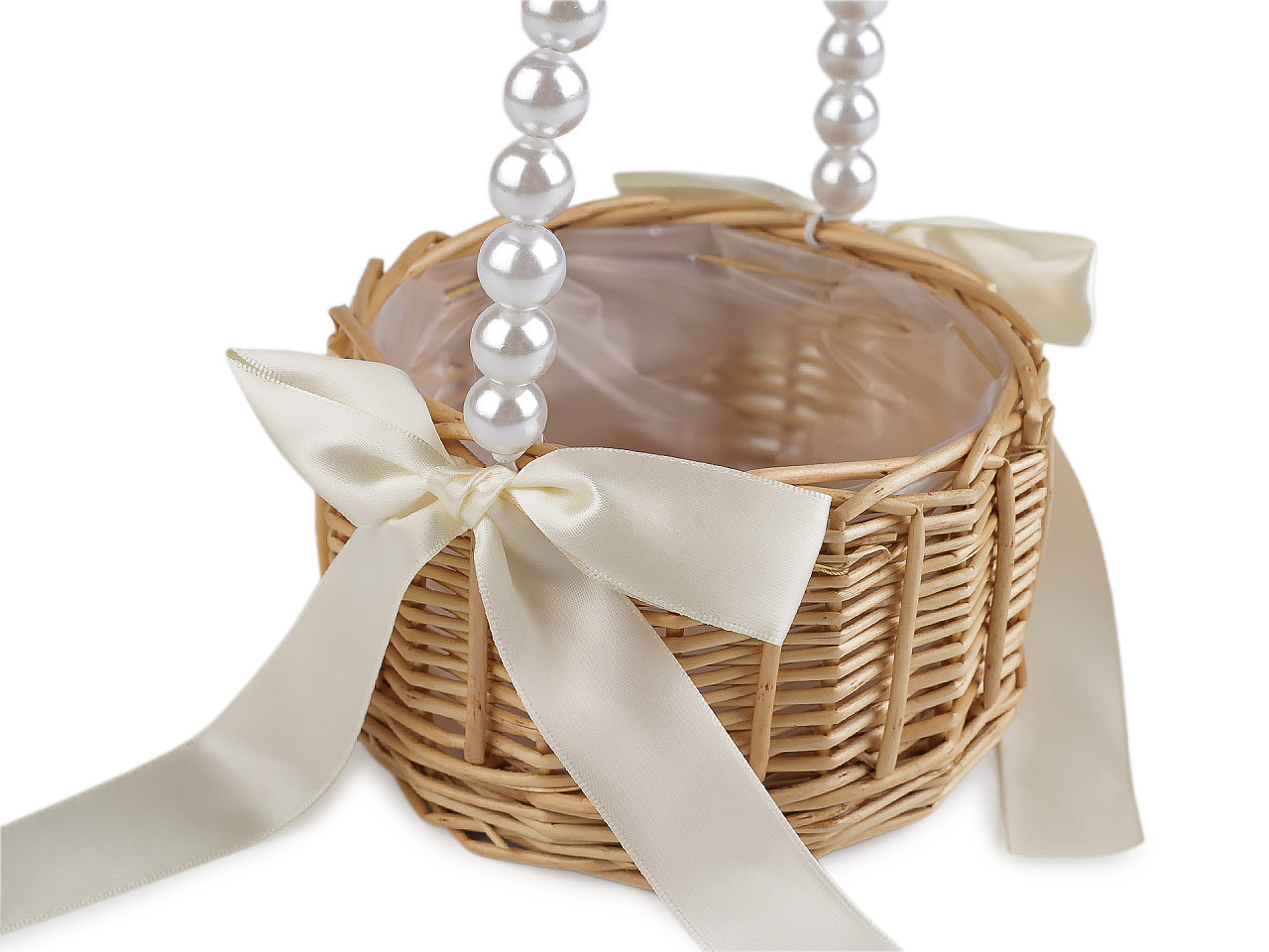 Ucho košíčku zdobí jemné plastové perly a po stranách najdete elegantní saténové mašle, které dodávají slavnostní vzhled. Dokonalá kombinace přírodních materiálů a jemných detailů vytváří harmonický design, který se stane nepřehlédnutelným doplňkem každé svatby.
