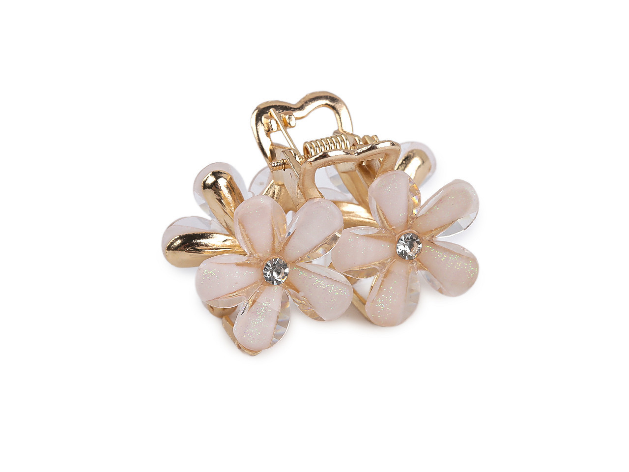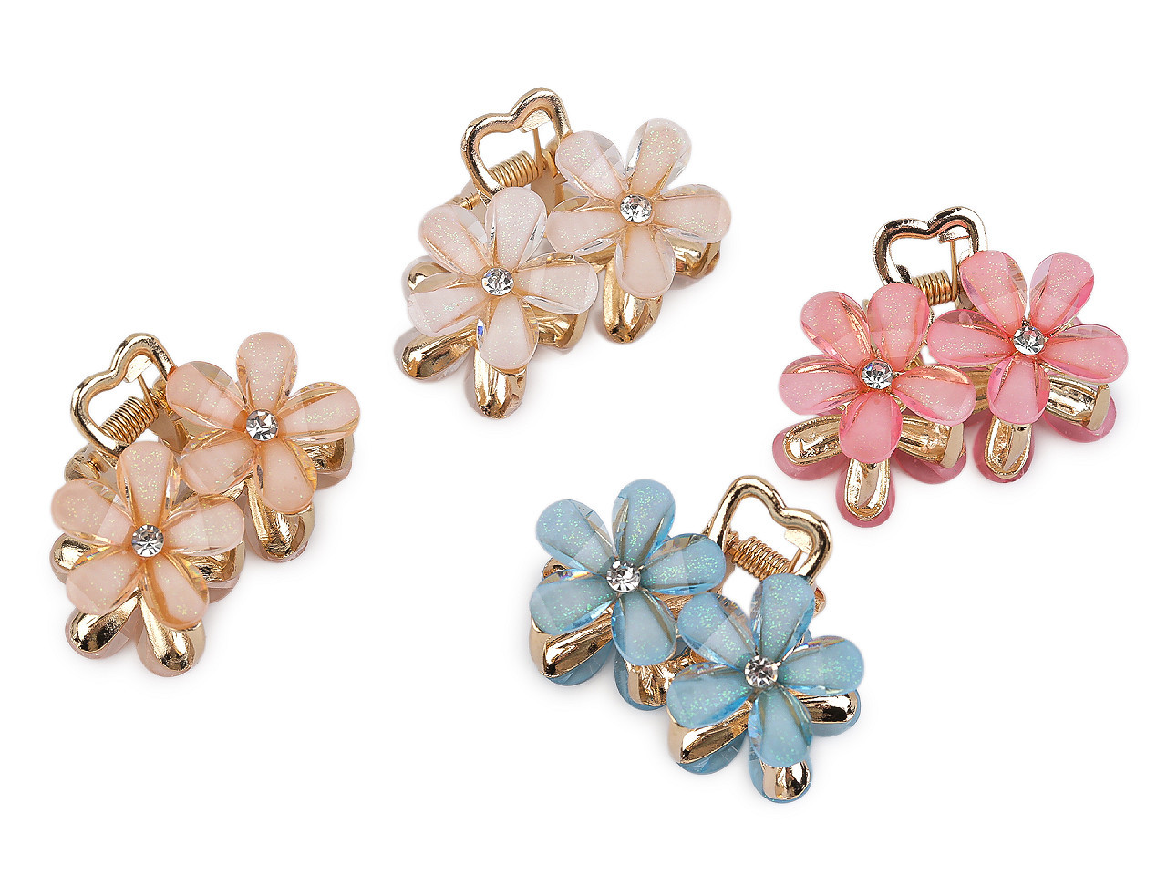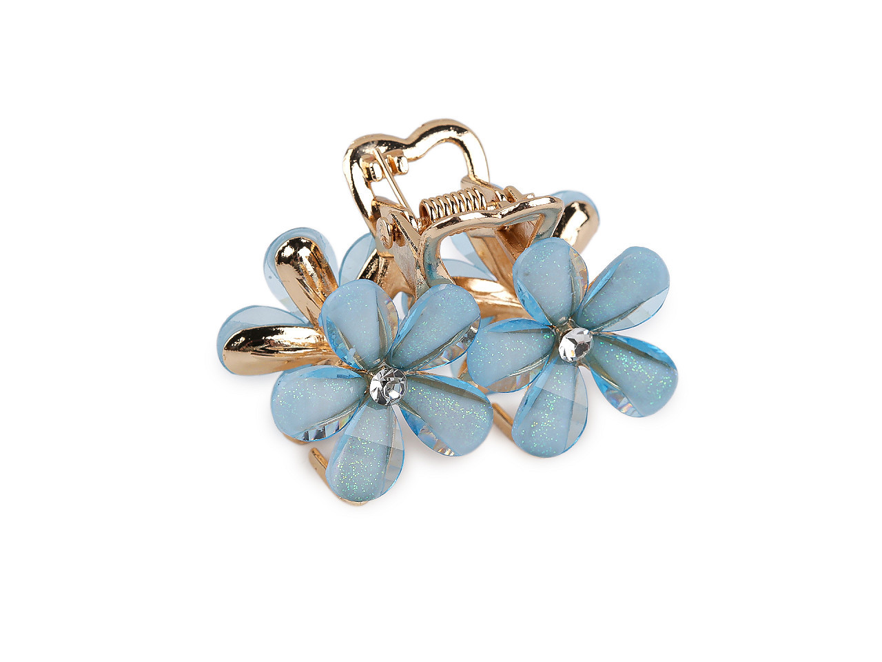 Kovový skřipec do vlasů s třpytivými květinami – elegantní úprava účesu. Dodajte svému účesu romantický lesk s kvalitním kovovým skřipcem zdobeným květy z probarveného plastu se zalitými glitry. Broušený kamínek uprostřed každého květu zajišťuje jemný třpyt, který vynikne na slunci i pod umělým světlem. Silný stisk a dlouhé zuby skřipce udrží vlasy pevně na místě po celý den. Ideální pro každodenní nošení, slavnostní události, svatby nebo večírky.