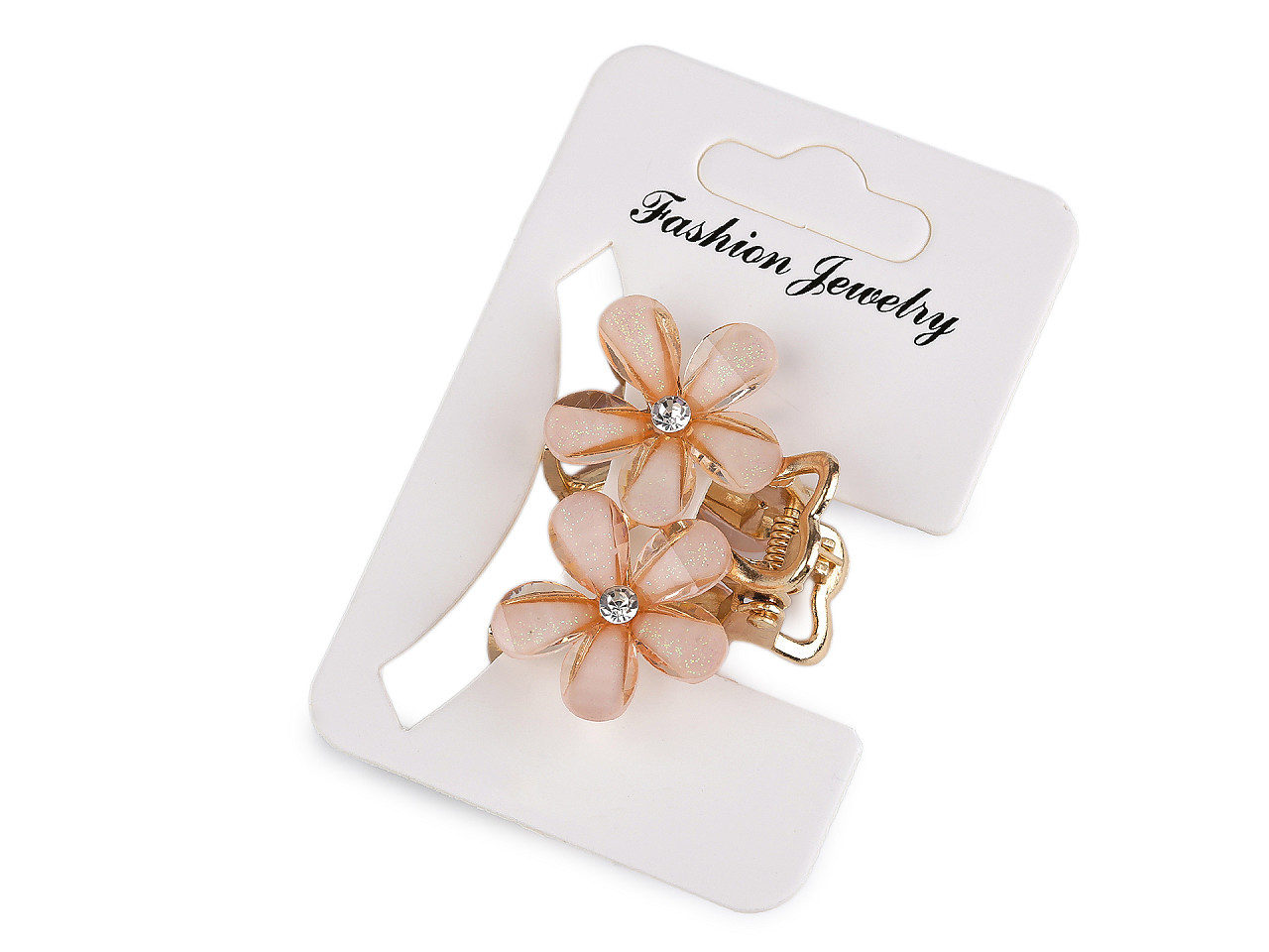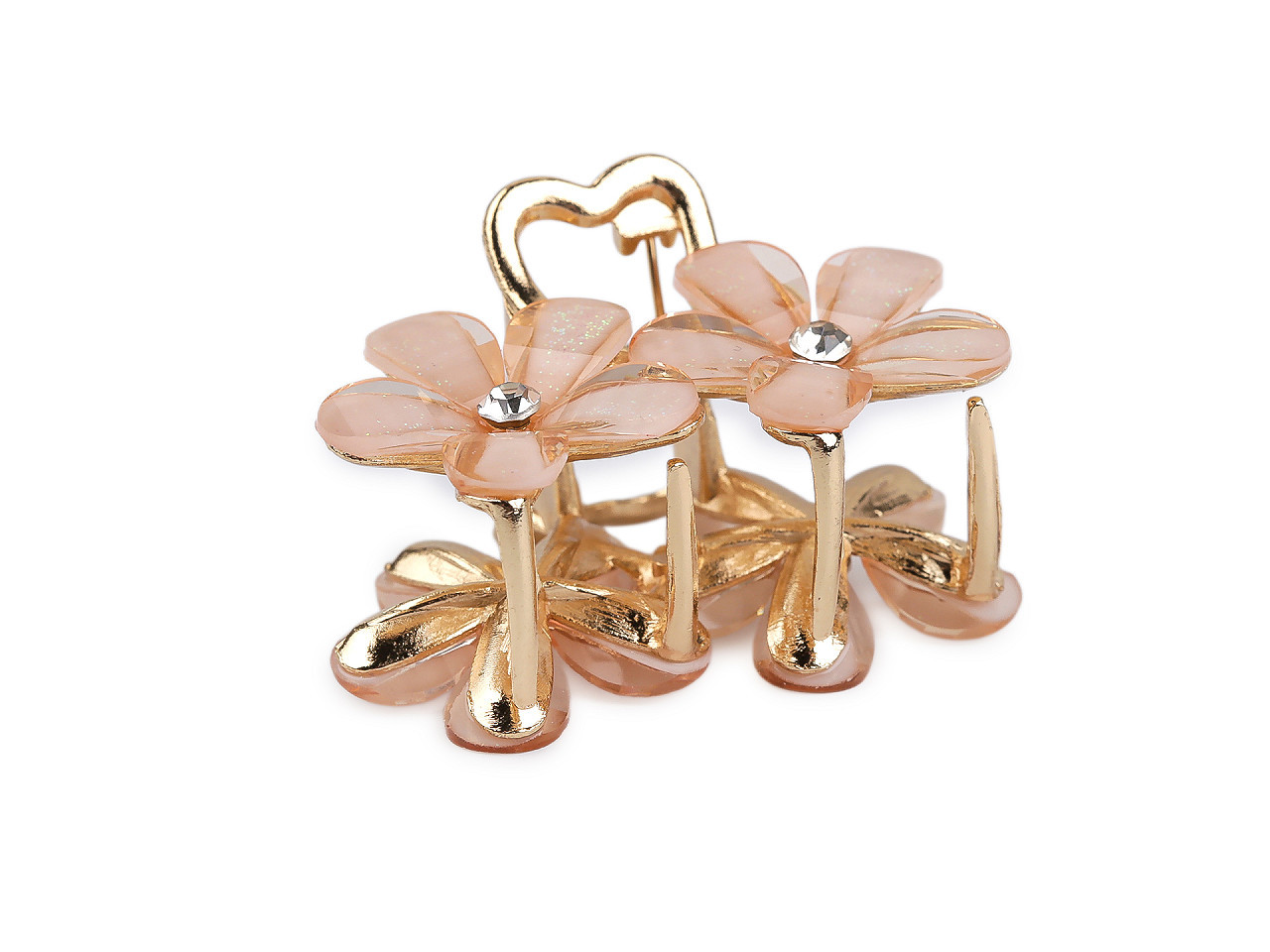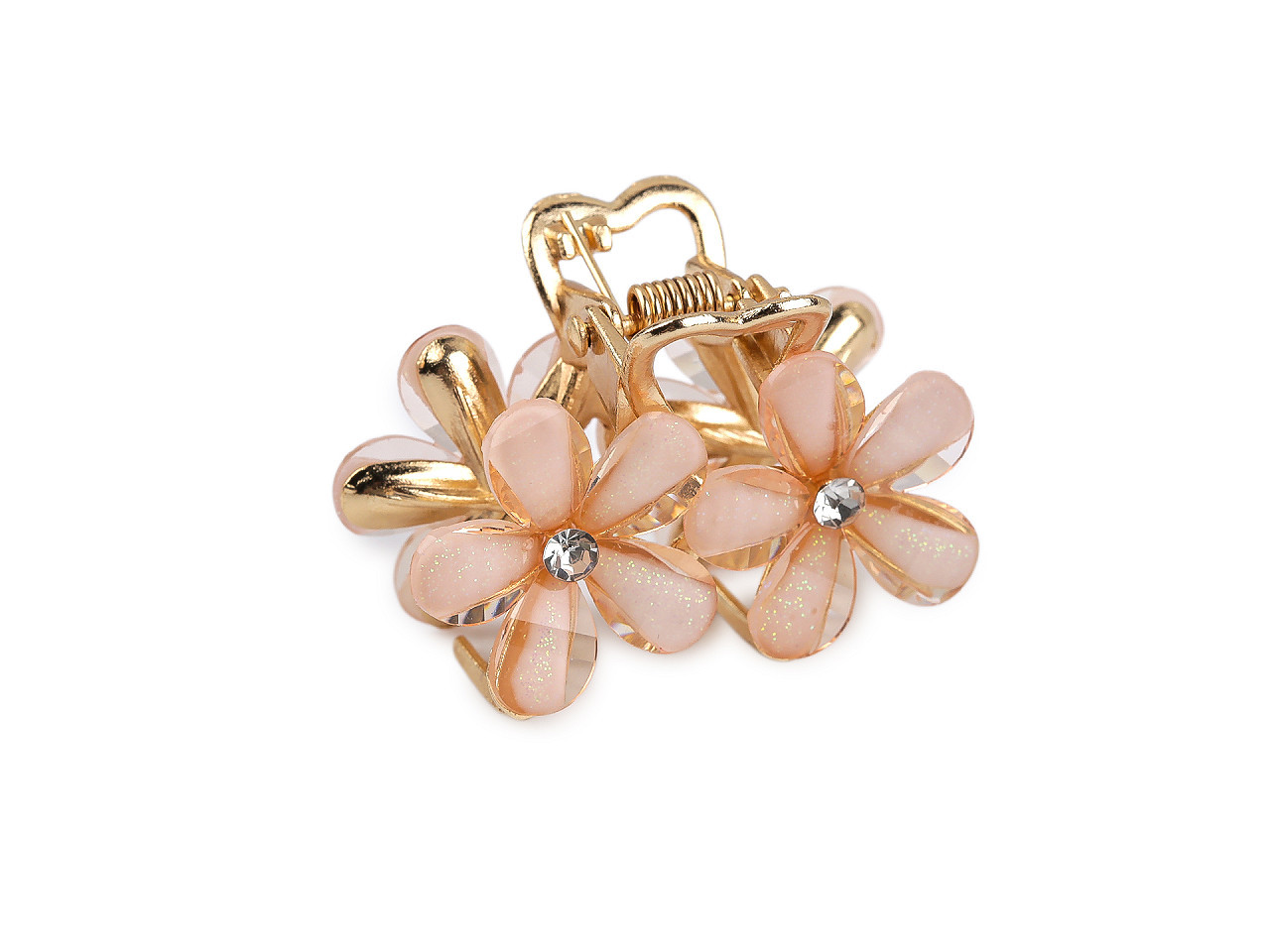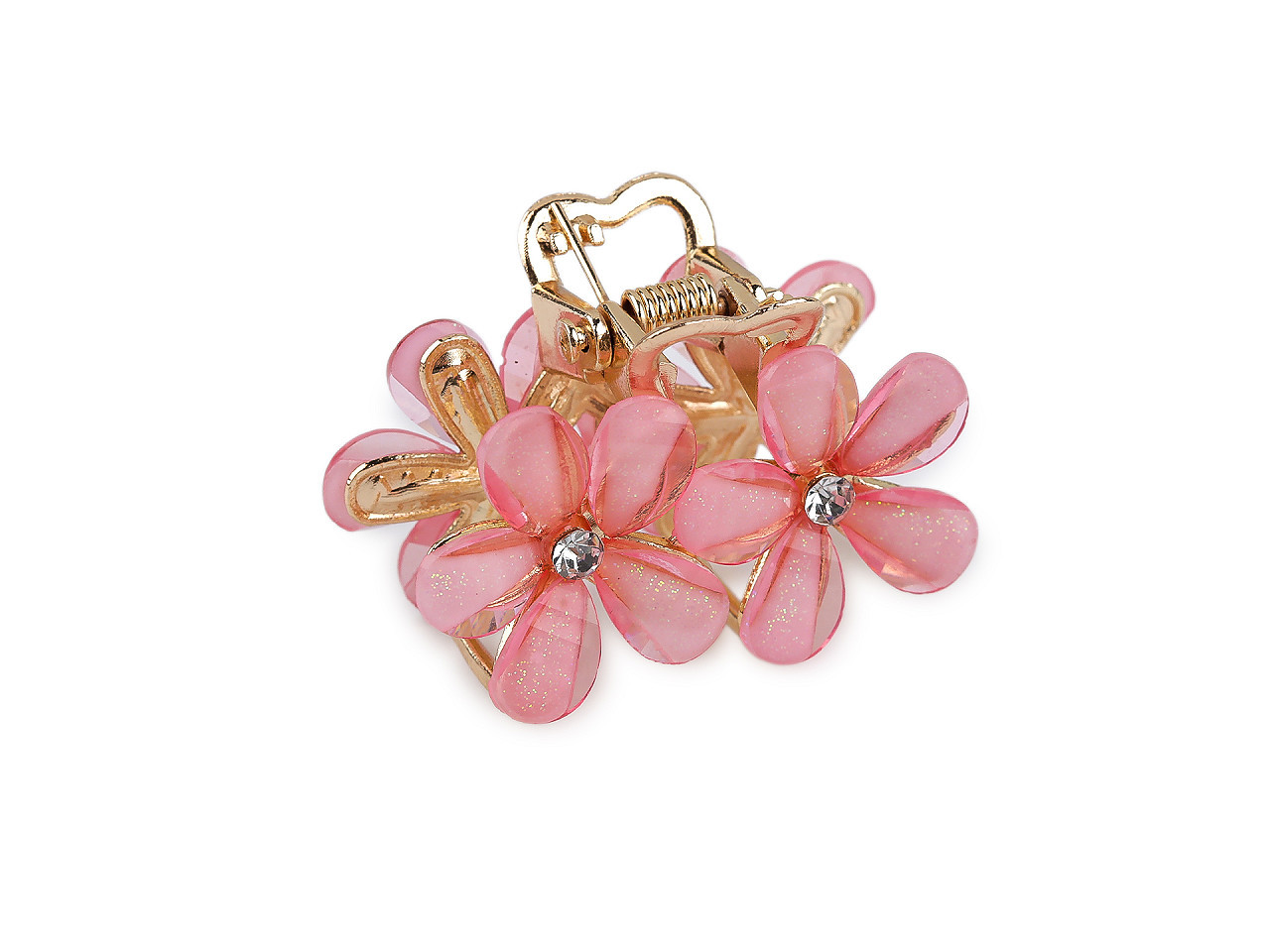 Kovový skřipec do vlasů s třpytivými květinami – elegantní úprava účesu. Dodajte svému účesu romantický lesk s kvalitním kovovým skřipcem zdobeným květy z probarveného plastu se zalitými glitry. Broušený kamínek uprostřed každého květu zajišťuje jemný třpyt, který vynikne na slunci i pod umělým světlem. Silný stisk a dlouhé zuby skřipce udrží vlasy pevně na místě po celý den. Ideální pro každodenní nošení, slavnostní události, svatby nebo večírky.