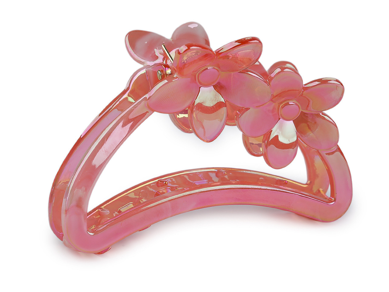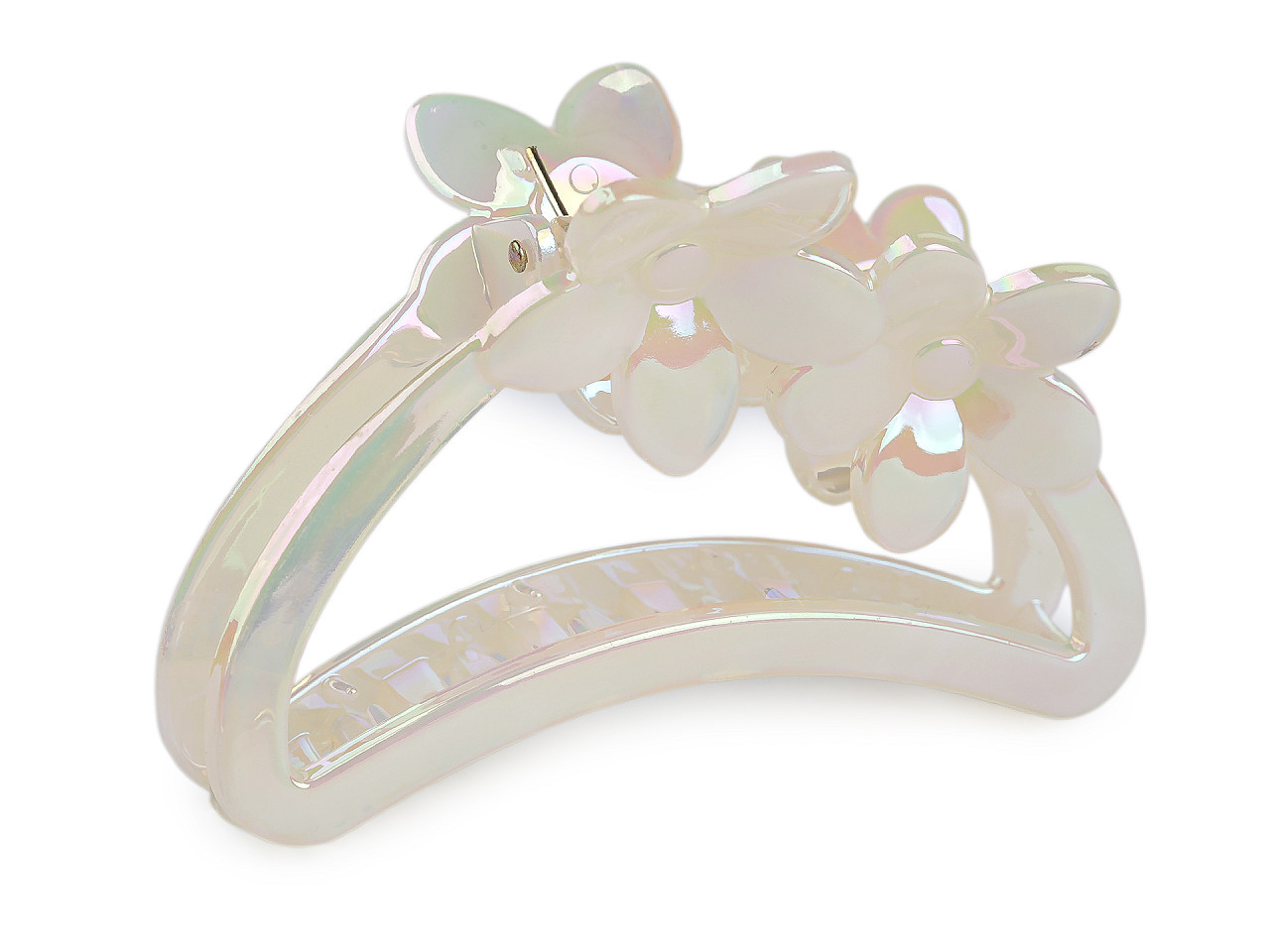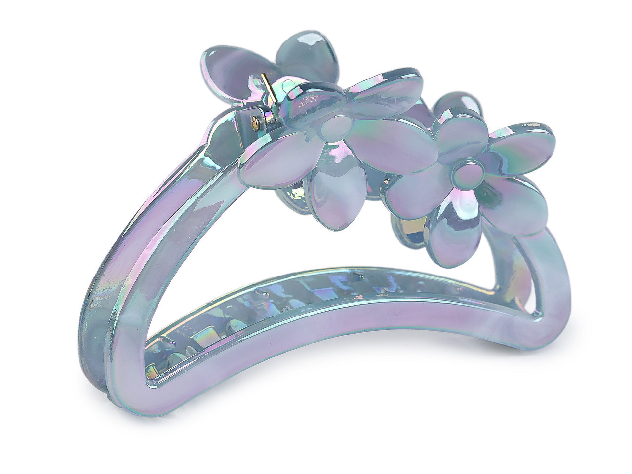 Skřipec do vlasů s květinovým motivem a perleťovým AB efektem. Dodáte svému účesu šmrnc a romantický nádech během několika vteřin. Tento elegantní skřipec do vlasů s jemnými květinami je ideální pro ženy, které preferují praktické a stylové doplňky místo klasických gumiček. Speciální povrchová úprava AB – Aurora Borealis vytváří kouzelné barevné odlesky podle světelných podmínek, takže váš účes bude vždy působit výjimečně.