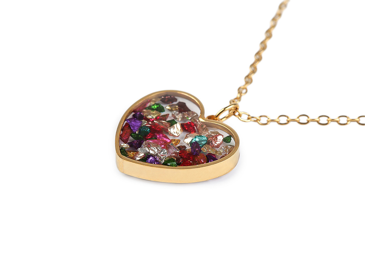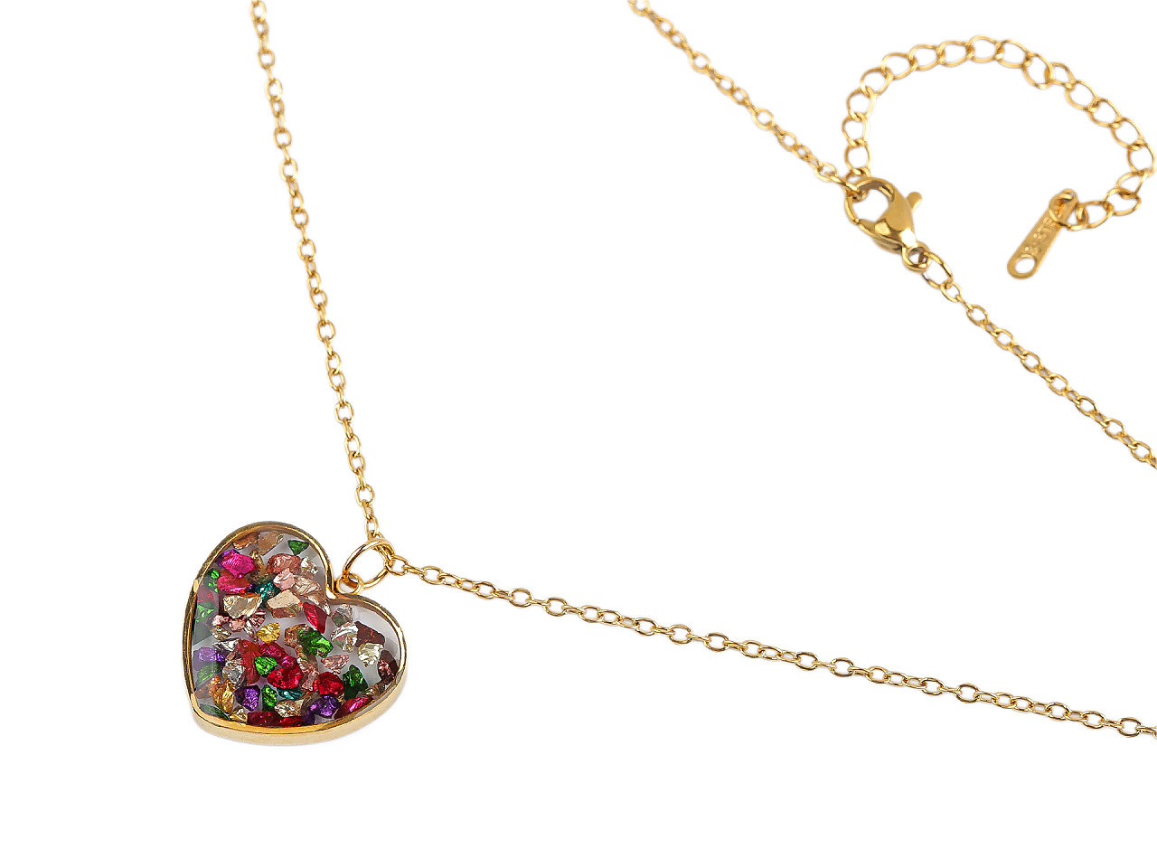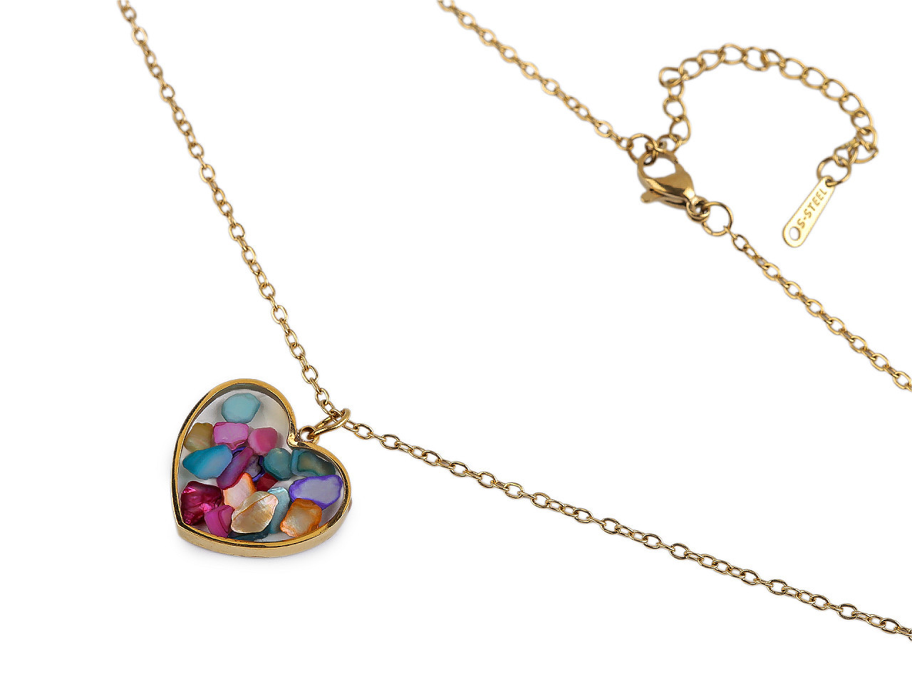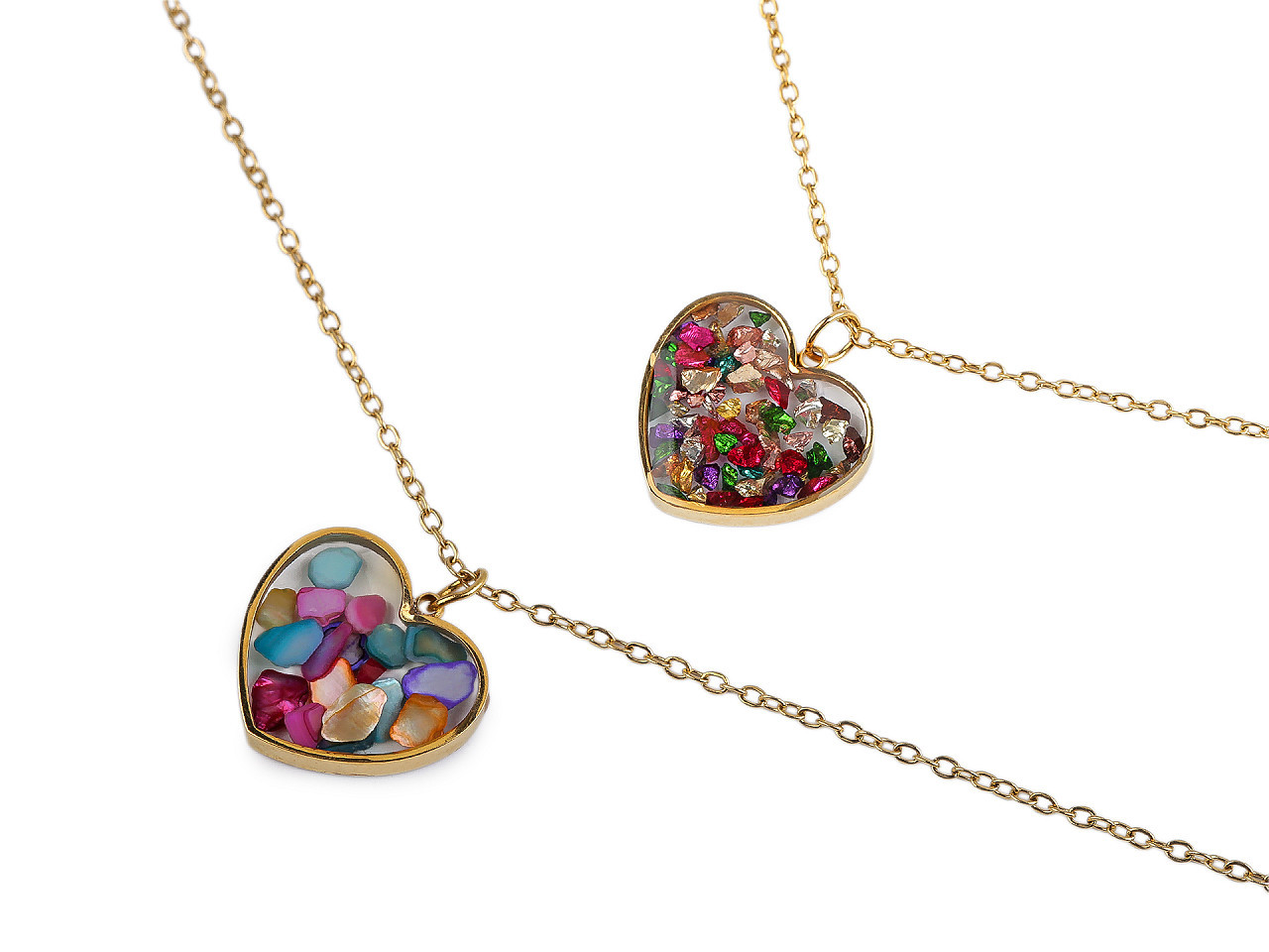 Elegantní náhrdelník z nerezové oceli – srdce s perleťovými či kamínkovými zlomky. Objevte krásu a odolnost v jednom! Tento řetízkový náhrdelník s oboustranným přívěskem ve tvaru srdce je vyroben z kvalitní nerezové oceli, která je hypoalergenní, neobsahuje těžké kovy a odolá poškrábání, korozi i vodě. Uvnitř srdce, zalitého do křišťálové pryskyřice, najdete jemné perleťové zlomky nebo broušené kamínky, díky nimž šperk poutá pozornost a působí originálně.