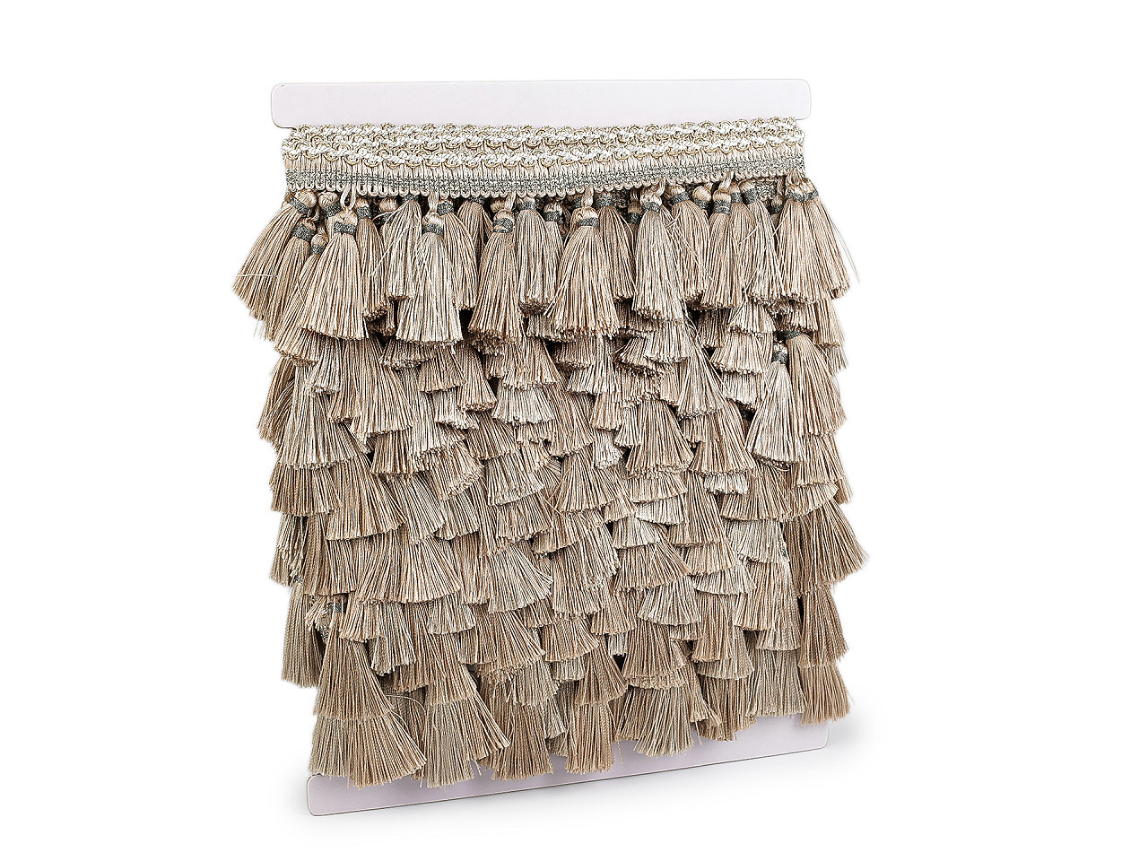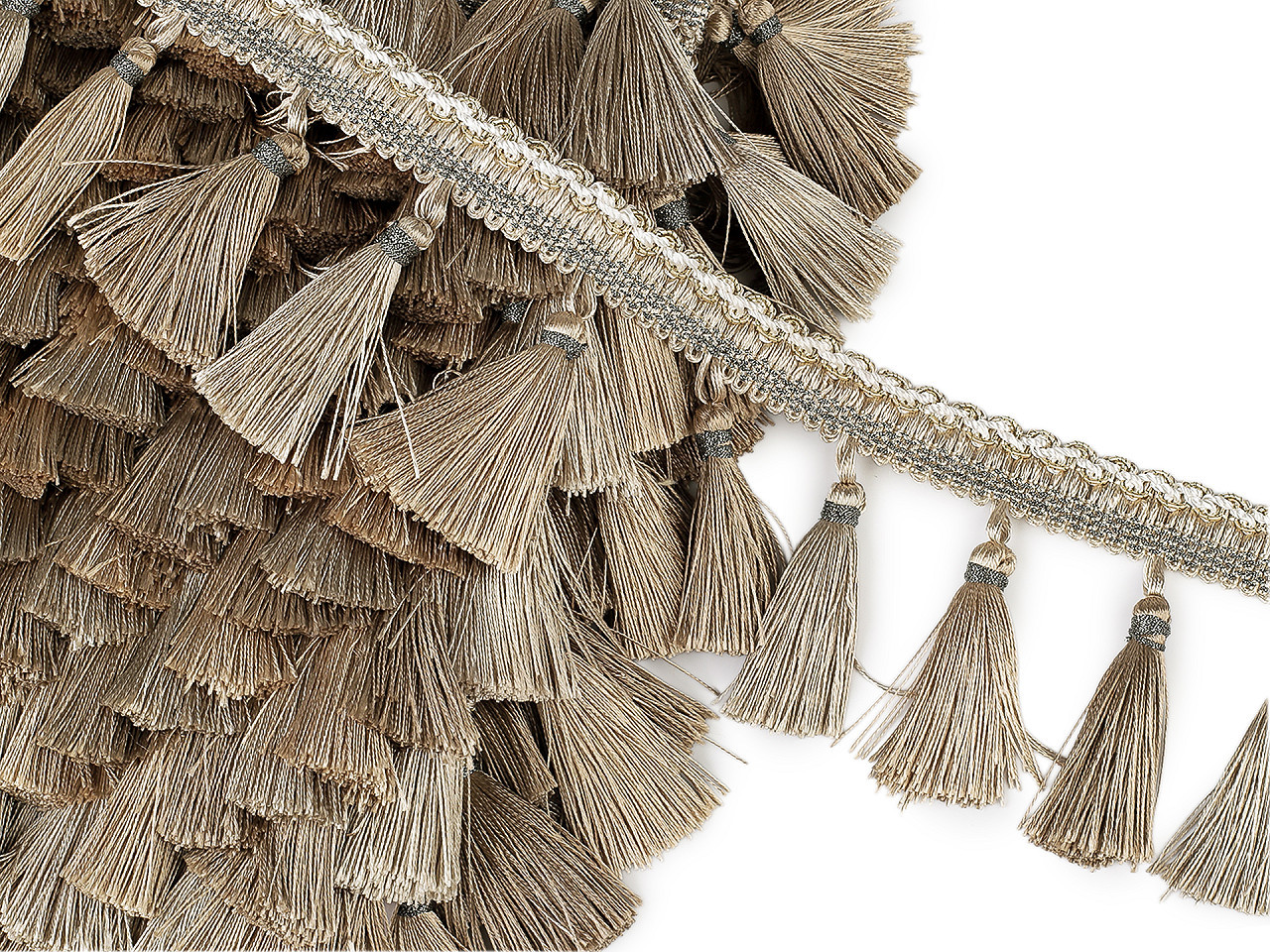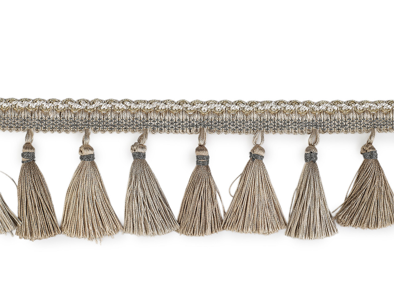 Hustý prýmek se střapci – elegantní ozdobný doplněk. Dodejte svým interiérovým dekoracím luxusní vzhled pomocí hustého prýmku se střapci. Tento dekorativní prvek je ideální pro olemování závěsů, ubrusů, dekoračních polštářů, přehozů nebo čalounění nábytku, jako jsou křesla či pohovky.