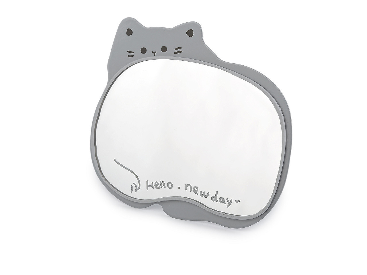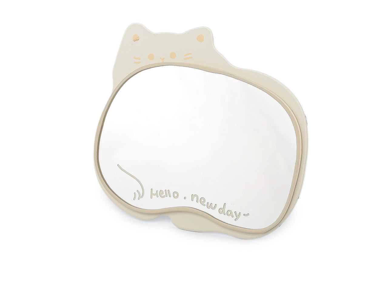 Kosmetické zrcátko se stojánkem – design kočka. Stylové kosmetické zrcátko s praktickým sklápěcím stojánkem a roztomilým motivem kočky je ideální pro každodenní péči o vzhled. Díky stabilnímu kovovému provedení jej snadno postavíte na stůl, toaletku nebo parapet u okna, kde je nejlepší denní světlo. Skleněná plocha zdobená jemným potiskem tlapky a nápisem "Hello new day" dodává zrcátku šmrnc i veselý nádech.