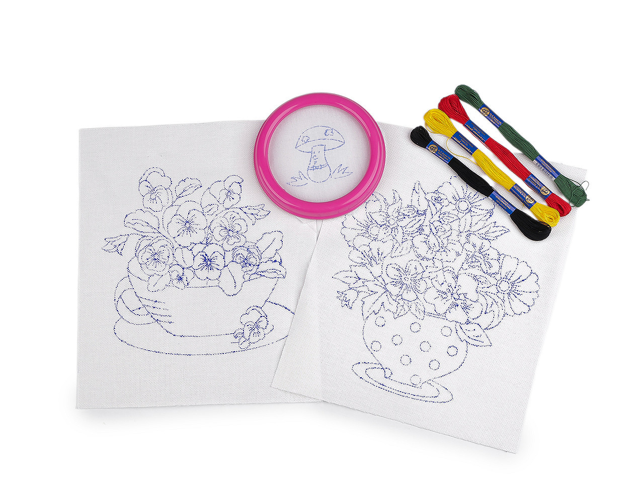 Zabavte vaše šikovné děti vyšíváním. Souprava dětského vyšívání obsahuje kulatý rámeček s látkou, která má předtištěný vzor, 4 kvalitní vyšívací příze mouline ze 100% bavlny a dvě větší plátna (23 x 26 cm) s předtištěnými motivy.