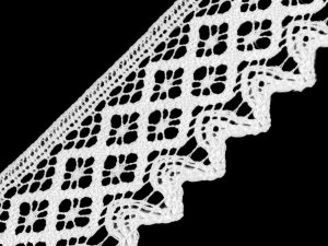 Bavlněná paličkovaná krajka je zdobená originálním motivem kosočtverců. Doporučujeme ji žehlit přes tkaninu.