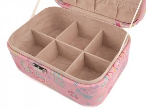 V horním patře jsou 4 přihrádky, 2 oddíly na prsteny, zrcátko a kapsa. Dolní patro je rozdělené na 6 přihrádek. Šperkovnice má velice kvalitní a precizní provedení.
