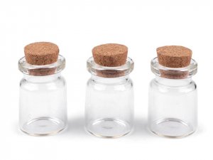 Skleněná lahvička s korkovým uzávěrem se dá využít ke skladování drobných předmětů jako jsou perličky, glitry, flitry apod. Můžete ji použít i jako přívěsek na krk. Lahvičku můžete dekorovat např. jemným barevným pískem, různými úlomky minerálů, kamínky, rostlinkami atd. nebo do ní lze vložit třeba i malý dopis. Jako šňůrku můžete použít kůži, která na přívěsku pěkně vynikne, řetízek či lanko.