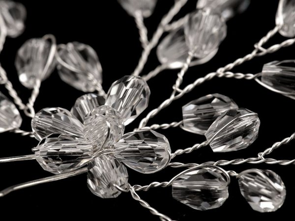 Elegantní vlásenka s broušenými korálky skvěle ozdobí slavnostní účes. Působí křehkou krásou, připomínající ledové království. Skleněné korálky se díky brusu jemně blýskají, celá ozdoba je ve vlasech nepřehlédnutelná. Díky drátkům ji můžete tvarovat. Je vhodná do společenských účesů i pro nevěsty v jejich den.