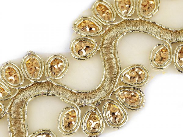 Prýmek na monofilu zdobí výšivka, která se elegantně třpytí díky lurexovým vláknům a drobným flitrům. Prýmek využijete ke zdobení společenských a plesových šatů, halenek nebo kostýmů. Můžete ho použít do dekoltů, na lemy, apod. Je také vhodný k oživení psaníček nebo bytového textilu.