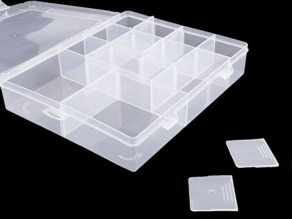Má 12 malých přihrádek o velikosti 4 x 4 x 3,5 cm a 2 větší přihrádky o velikosti 8 x 8 x 3,5 cm. Přihrádky si můžete regulovat pomocí odstranitelných přepážek. Krabička je uzavíratelná.
