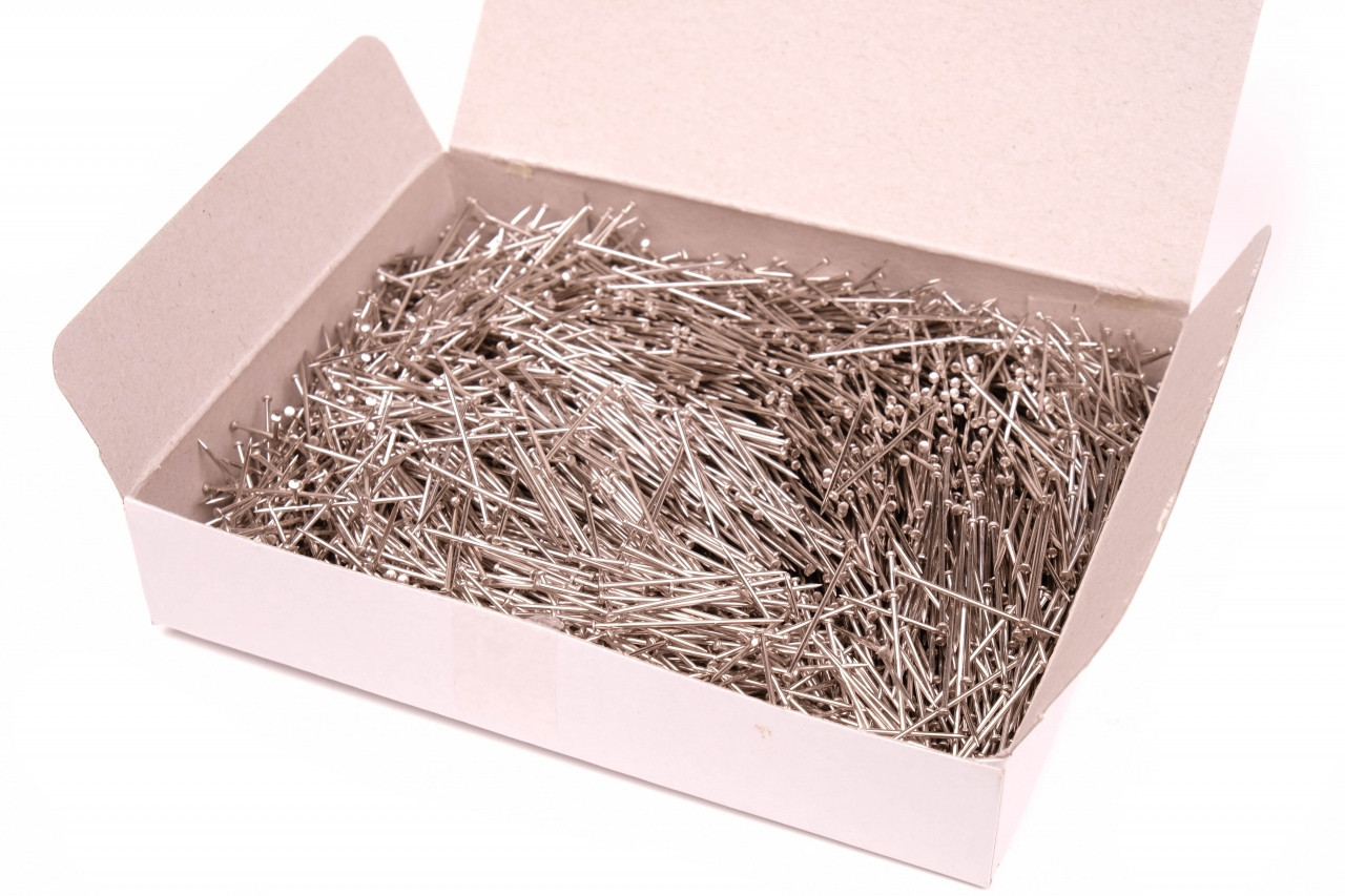 Špendlíky celokovové 103, papírová krabička 500g, délka špendlíku 26mm, průměr drátu 0,75 mm, průměr hlavičky 1,60mm, počet kusů v krabičce cca 4800 ks.
